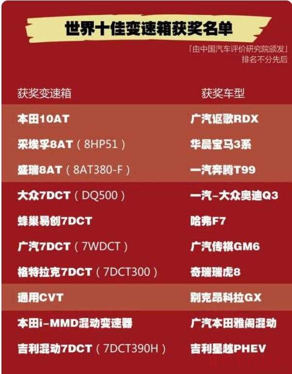 格特拉克、爱信等等。那么国产自动变速箱真的没有能拿得出手的吗?那可不一定!2020年,汽车评论研究院公布的第三届世界十佳变速箱获奖名单中,前十款变速箱,合资品牌占了6席,国产品牌占了4席。奇瑞瑞虎8用的是