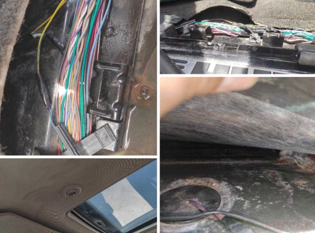 不过检查内饰细节事,打开门槛梁饰板,好家伙线束和地毯上都是水,空腔里面也发霉了,天窗也漏水顶棚上面全是水痕,泡水肯定是跑不了了。