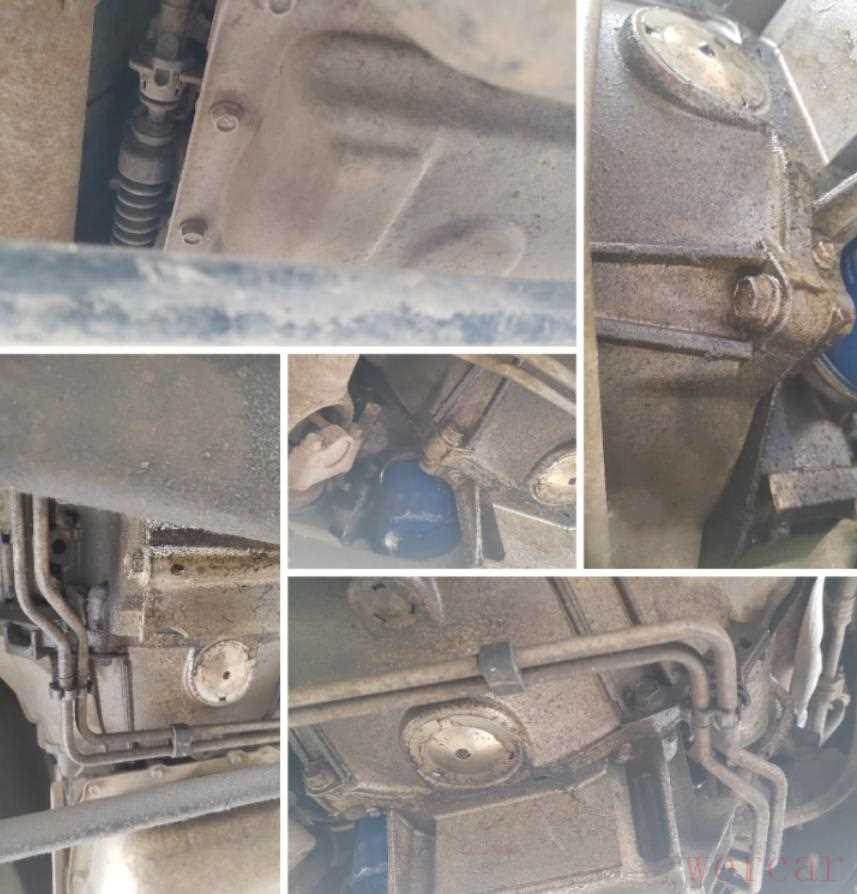 检查发动机变速箱下部,可以看到发动机漏油,发变连接处漏油,变速箱无漏油痕迹,变速箱油管渗油,发动机变速箱无拆卸维修痕迹。