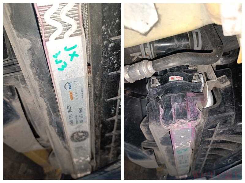左侧水箱都托底损坏更换了,换的副厂件,你说兰博基尼的车主买不起原厂件吗?所以,嘿嘿..而且这后换的水箱似乎还漏防冻液了,看到红色的液体痕迹了吗?