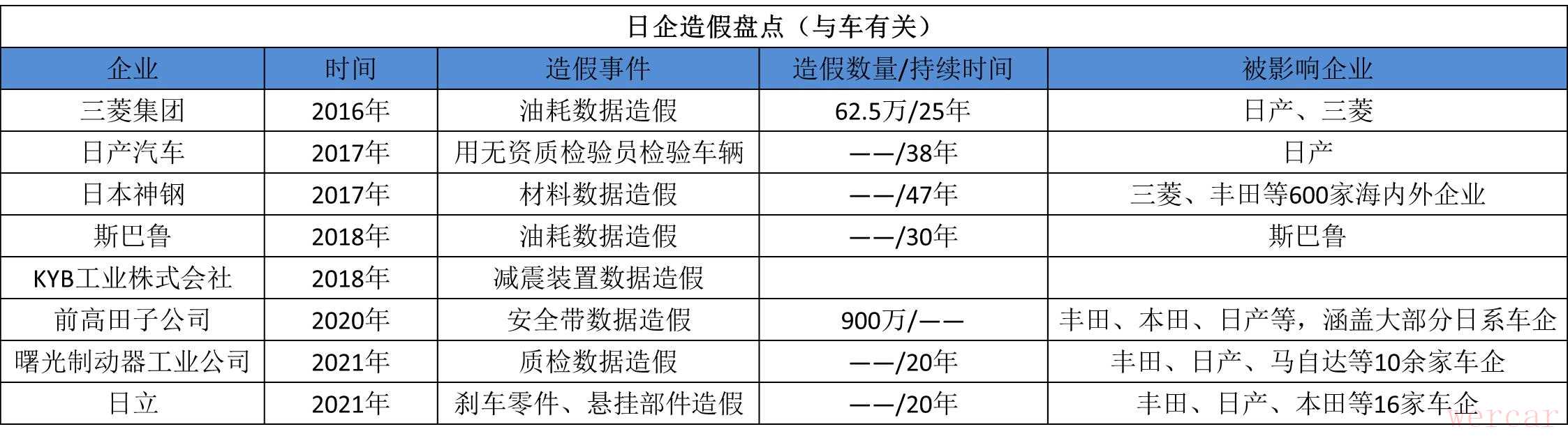 其实关于造假影响到车这事,已经不是第一次出现在日企身上了,像2016年,日本三菱集团的25年爆油耗数据造假;2017年,日本日产汽车让没有任何资质的检测人员对汽车出厂进行终检工作;2018年,日本KYB工业株式会社被爆在免震装置和减震装置上篡改性能检查记录数据等,日企在造假事件可以说是不胜枚举。