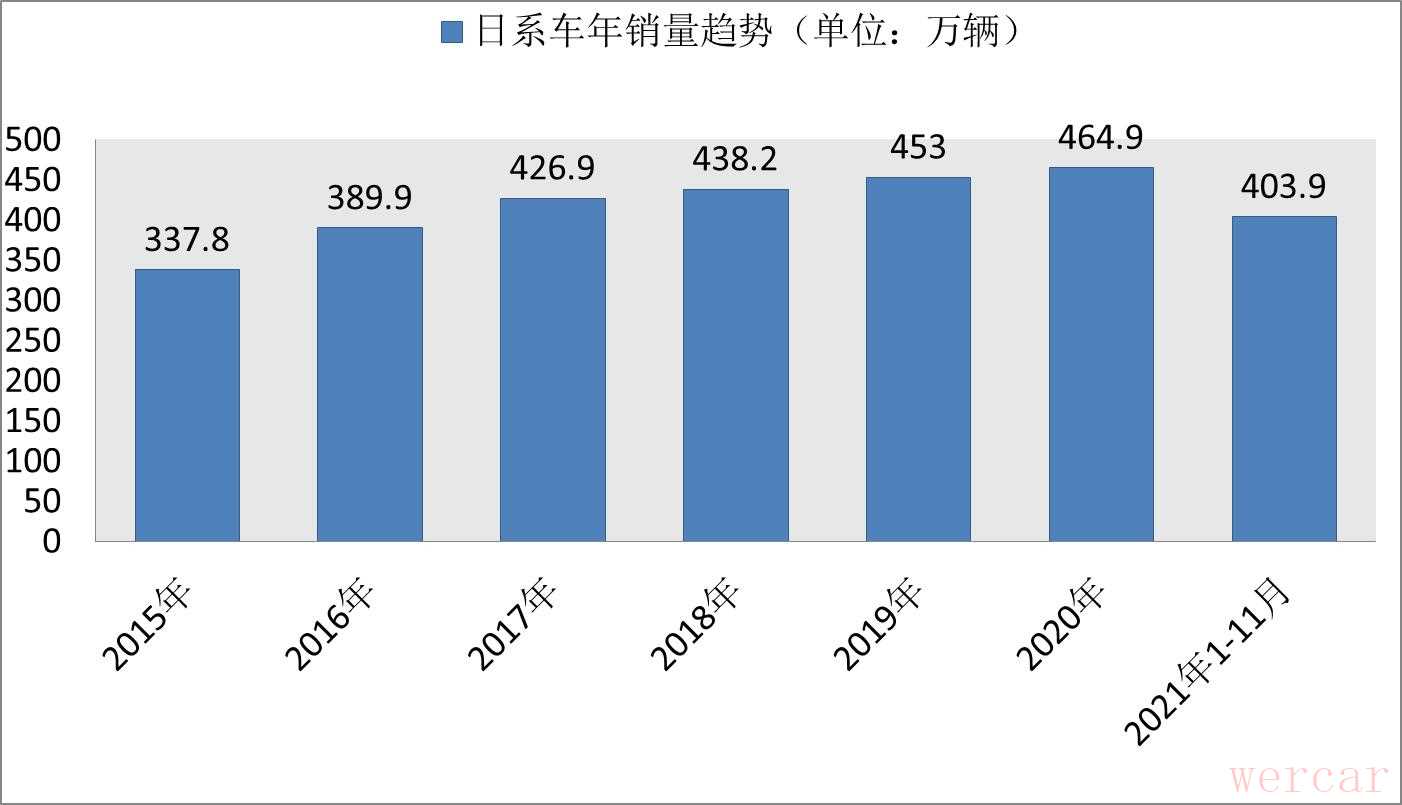 按理说那么多造假、负面消息缠身,日系车的口碑应该越来越差,反映在数据上,就是销量越来越差才对。但是,当疆哥去查看国内日系车的销量时,却会发现日系车正卖得越来越好,2017年至今,日系车已经连续5年年销突破400万,接近德系车的市场份额。