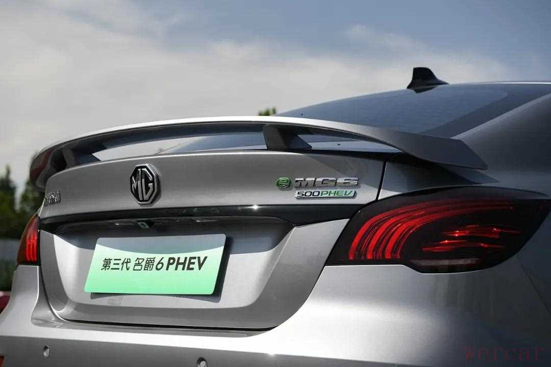 移步到车尾,整体造型丰满、耐看,与车头遥相呼应,充满视觉张力。尾部最吸睛的当属大尾翼了,尺寸更是超过了后尾箱盖。全LED尾灯造型新颖,修长的灯带让它在夜晚点亮后视觉效果出众,识别度很高。尾门上e MG6和500PHEV铭牌彰显了其身份,这也是区别于汽油版车型的地方。