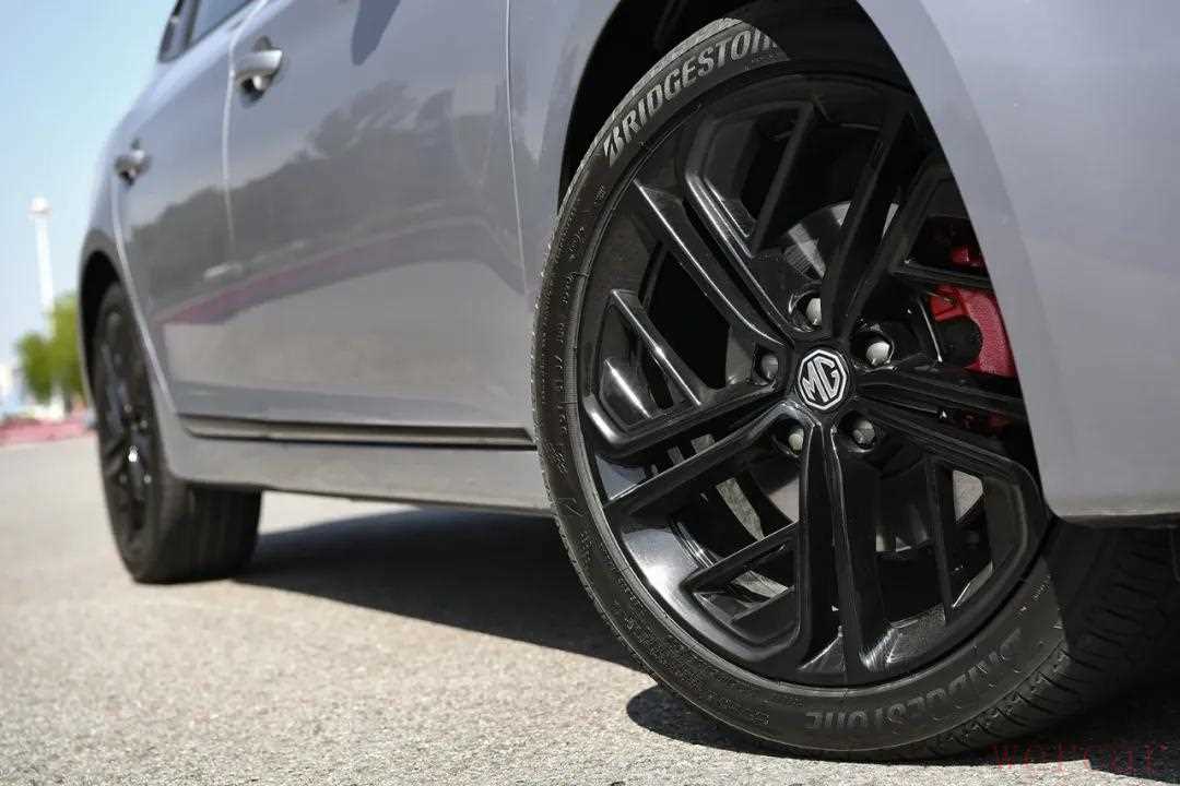 轮圈造型独特,很有运动感,并且酷黑的涂装更是点睛之笔。轮胎匹配的是普利司通泰然者T005系列轮胎,尺寸规格为225/45 R18。