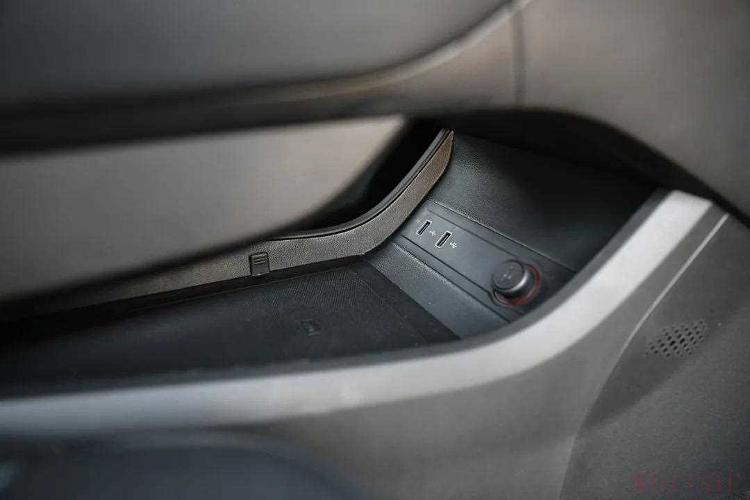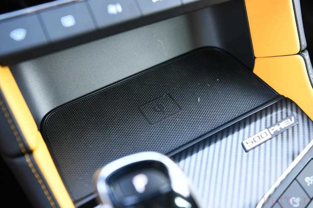 屏幕下方为无线充电模块,由于采用了电子换挡机构,中控台下方进行了掏空处理,可以用来放一些私密物品。对于这类主打运动性能的车型来说,相对多的储物空间,特别能赢得额外的赞扬。