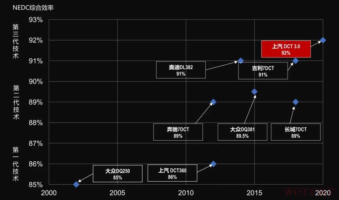 全新一代的7速湿式双离合变速器,相比老款首先在NEDC传动效率方面有极大的提升,其最大传动效率可以达到97%,综合效率可以达到92%,从官方提供的资料来看这应该目前传动效率和油耗表现最佳的双离合变速器。并且其采用了全球首创的三腔蜂巢润滑技术有着独立的冷却设计,可以保证变速器的所有部件都可以得到充分的润滑且处于最佳的工作油温,再加上从原来机械+电驱执行系统升级到了14V的全电驱执行系统,整体的换挡速度,NVH以及换挡的平顺性都有极大的提升。