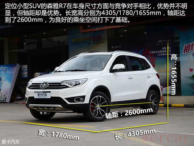 空间和动力小结:作为一辆小型SUV来说,森雅R7无论是乘坐空间还是储物空间都做到了同级别的平均水平。新车全系搭载1.6L发动机,配5速手动变速箱。在4月27号森雅R7正式上市时,现车还公布了将会配备6速自动变速箱的车型预售价区间,不高于9.69万元。未来配备自动变速箱的森雅R7同样是该细分市场的重要实力选手。