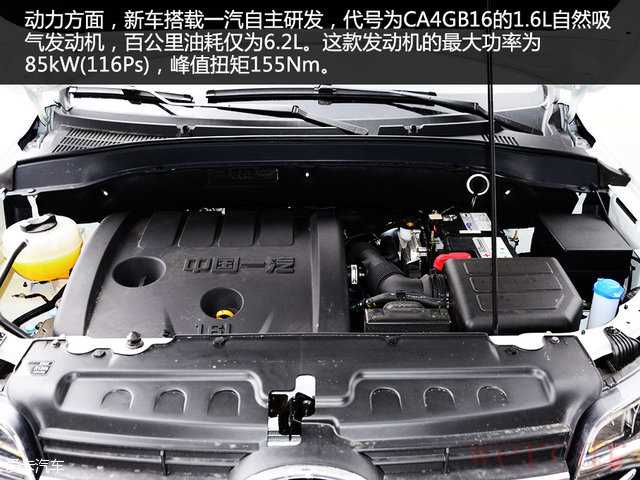 动力方面,新车搭载一汽自主研发,代号为CA4GB16的1.6L自然吸气发动机,百公里油耗仅为6.2L。这款发动机最大功率85kW(116Ps),峰值扭矩155Nm。这台发动机同样用在一汽奔腾B30上,但后者的发动机最大马力只有109Ps。传动方面,与之匹配5速手动变速箱。