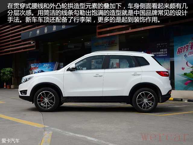 "侧面轮廓:" 身材紧凑,但比例协调。悬浮式车顶是很多同级别车型的流行元素,在森雅R7上也很常见。车窗线条流畅,搭配动感的轮毂设计,进一步增强了运动感。