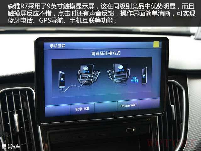 内饰方面,森雅R7具有两种内饰可选,实拍车型为动感的全黑内饰设计,而另外一种则是黑棕双色搭配的设计。另外,从实拍可见,中控台的屏幕采用悬浮式设计,下方设有一个储物格以及各种多媒体插口。拉丝饰板贯穿整个中控台,视觉上起到很好的分层作用。