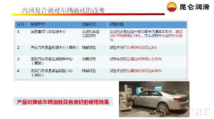 国家汽车质量检测中心(重庆)的试验结果表明,试验车的百公里油耗降低达3%;国家汽车质量监督检验中心(襄樊)的试验结果是百公里油耗降低达3.05%;国家汽车质量监督检验中心(襄阳)的试验结果是百公里油耗降低达4.88%。