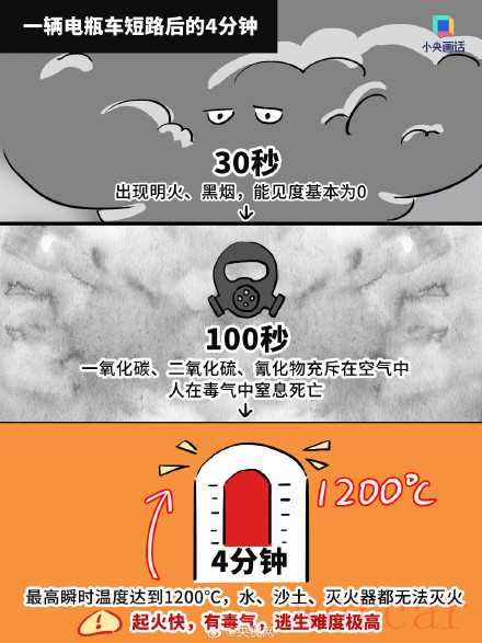 电瓶车电瓶(通常是锂电池)在短时间内发生短路是非常危险的,4分钟内会发生一系列严重且可能危及生命的情况: