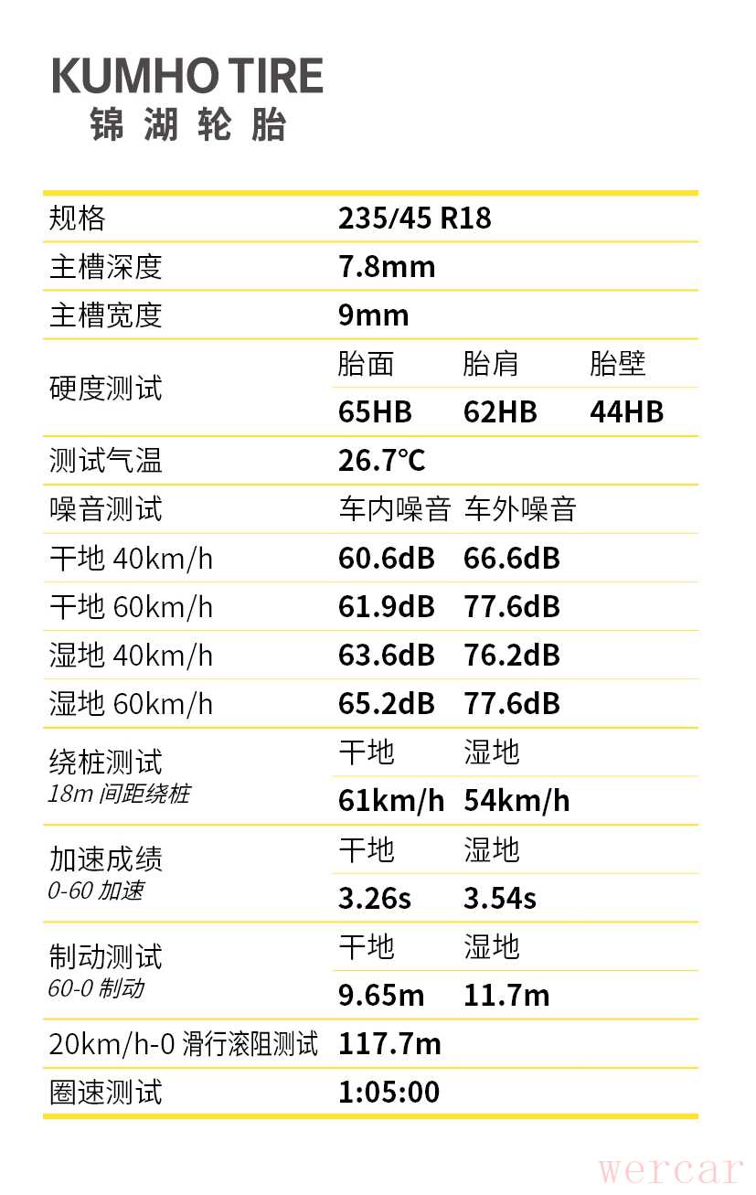 舒乐驰是锦湖旗下均衡舒适系列。这次测试用的 HS63 因为结构以及设计的优化让整体体验感得到了质的飞跃,在强化性能的同时又保证了静谧性。这款轮胎还有一个特点是比较重视操控性,不规则的花纹区分干湿地,加大了轮胎与地面的接触面积,测试过程中稳定性表现非常好。