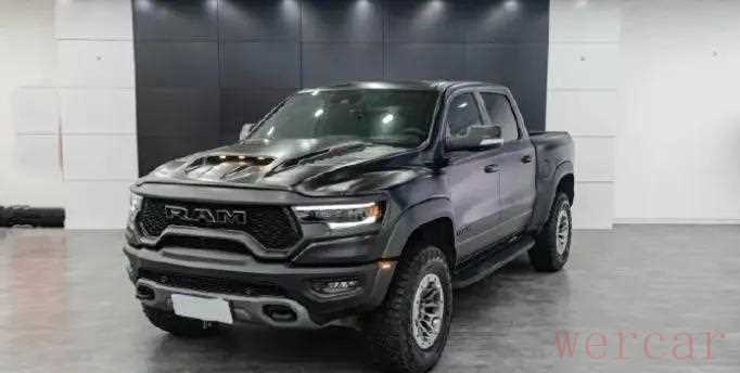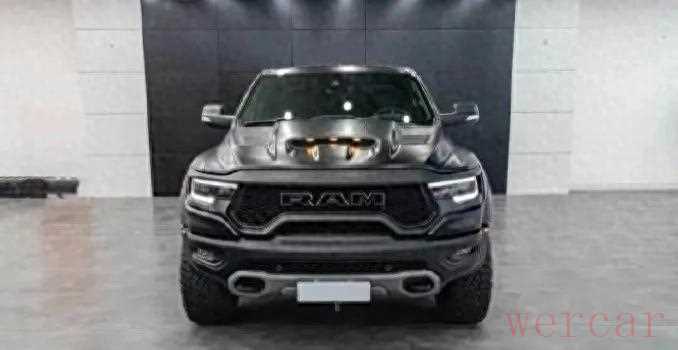 车头设计是一体式格栅,带黑色波浪纹中网,前大灯是复古风格的扁平样式,中间有个RAM车标。前舱盖有散热孔和肌肉线条,保险杠是黑色塑料材质,带防撞梁和拖车钩。车尾尾灯是C字形LED,后包围有三个颗粒突起,排气口是双出炮筒样式。车身侧面宽,轮眉和侧裙都是黑色,还有踏板方便上下车。