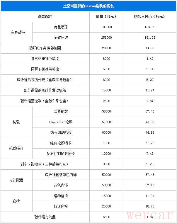 布加迪Chiron的官方售价为250万欧元,但是有250万欧元就可以买到这台神车了吗?NO!250万欧元仅仅是个开始,接下来是疯狂的选配件。土豪哥曾在网上公布了一份Chiron的基础选装配置的价格单,这里列出来给大家过过眼瘾。