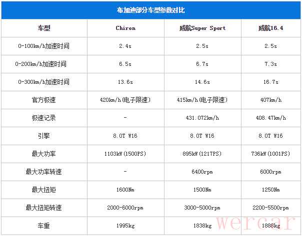 Chiron在今年日内瓦车展上首度亮相,依然搭载的是8.0T W16四涡轮增压引擎,但最大功率已经提升到了1103kW(1500PS),比威航Super Sport提升了208kW(283PS)。虽然目前官方公布的极速被限制在了420km/h,尚未达到威航Super Sport创造的431km/h的极速记录,但威航Super Sport的极速也仅仅被限制在415km/h。