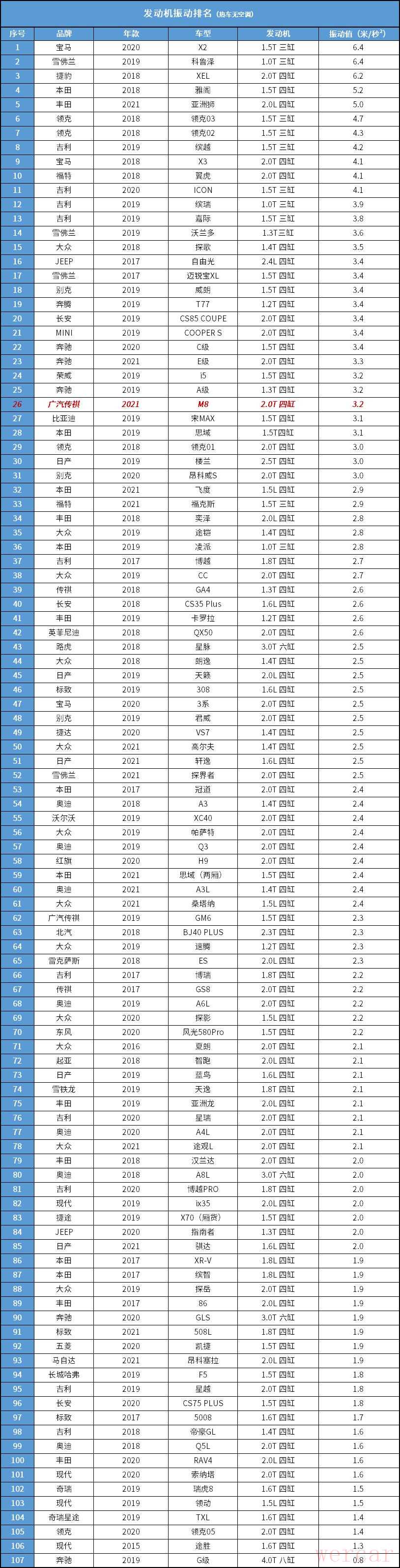 这辆广汽传祺M8搭载了一台2.0T四缸发动机,怠速振动数值为3.2米/秒²。发动机噪音