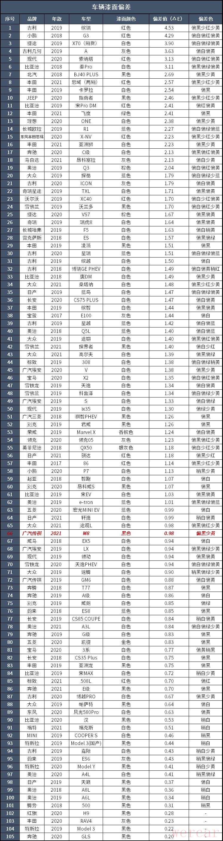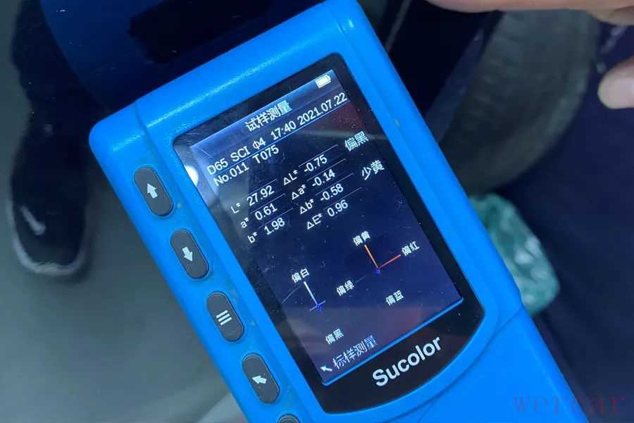 经过测试,最大色差值位于前保险杠处,色差值为0.96ΔE,比基准点偏黑少黄。从数值上看,广汽传祺M8的喷漆工艺质量控制还不错。