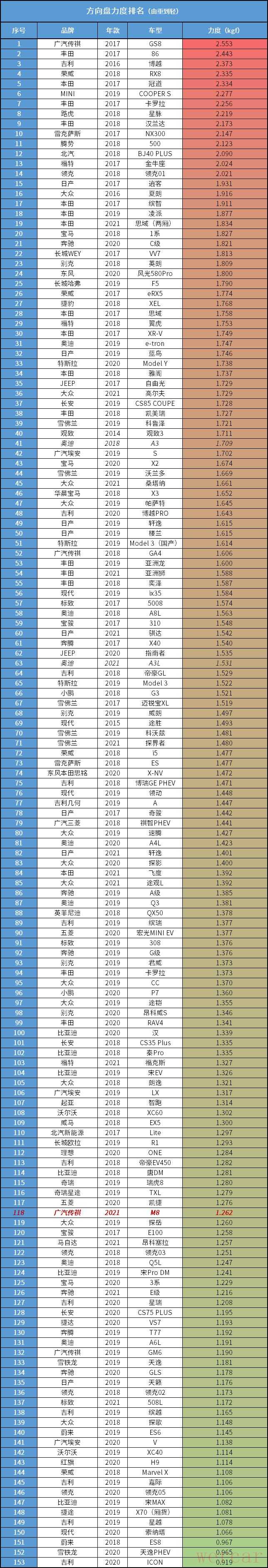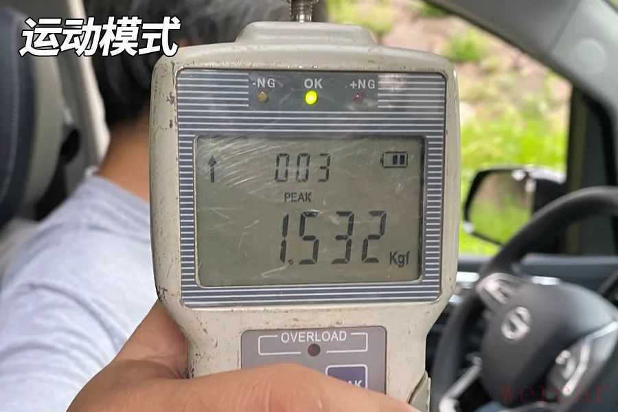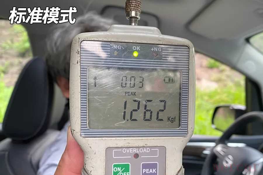 我们在同一路段(地面摩擦力相同),胎压调至厂家标准胎压,使用标准模式,用拉力计原地匀速旋转方向盘90度,取最大数值。