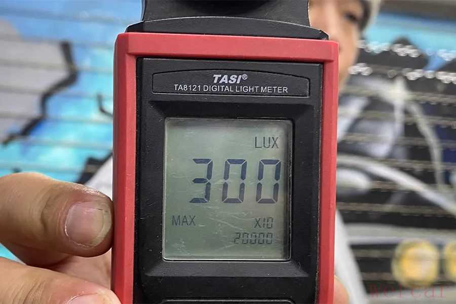 测试方法:以车灯最前端为基点,与垂直墙面相距2米距离,在发动机正常工作状态下进行测试,使用光线照度计取近光灯照明范围内的最大值。