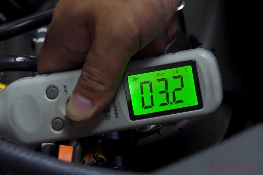 测试方法:水温正常后,关掉空调,在怠速状态下,使用测振仪垂直曲轴方向,将探针接触发动机金属机体中间的最高位置,测量发动机振动加速度值,数值越低,表明振动越小。