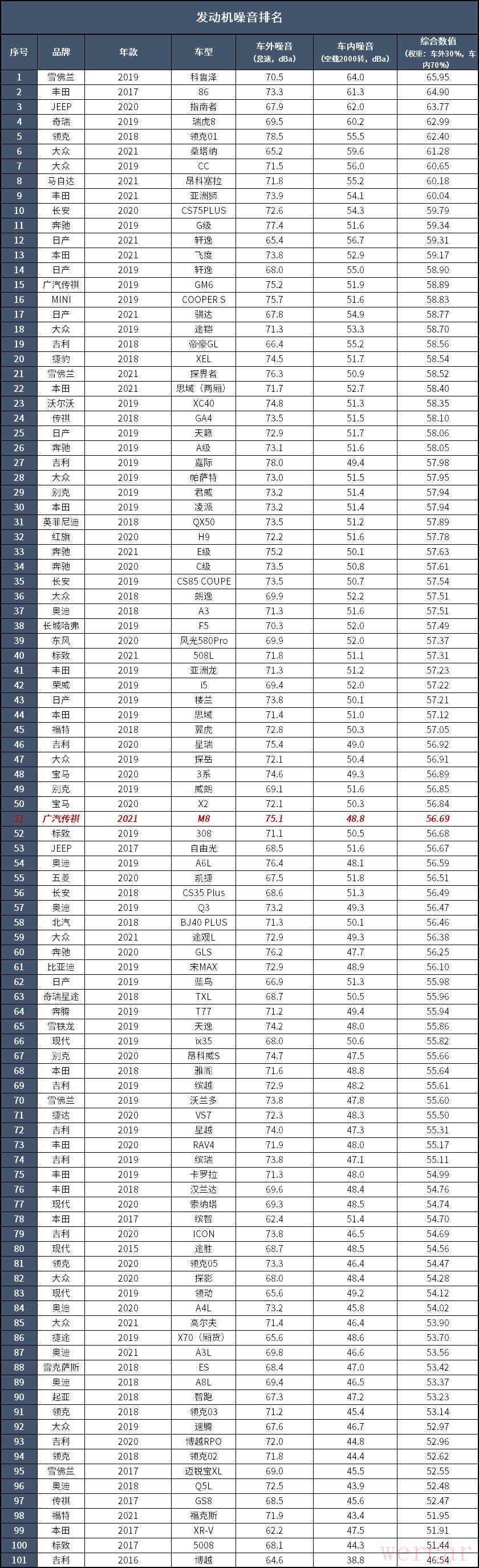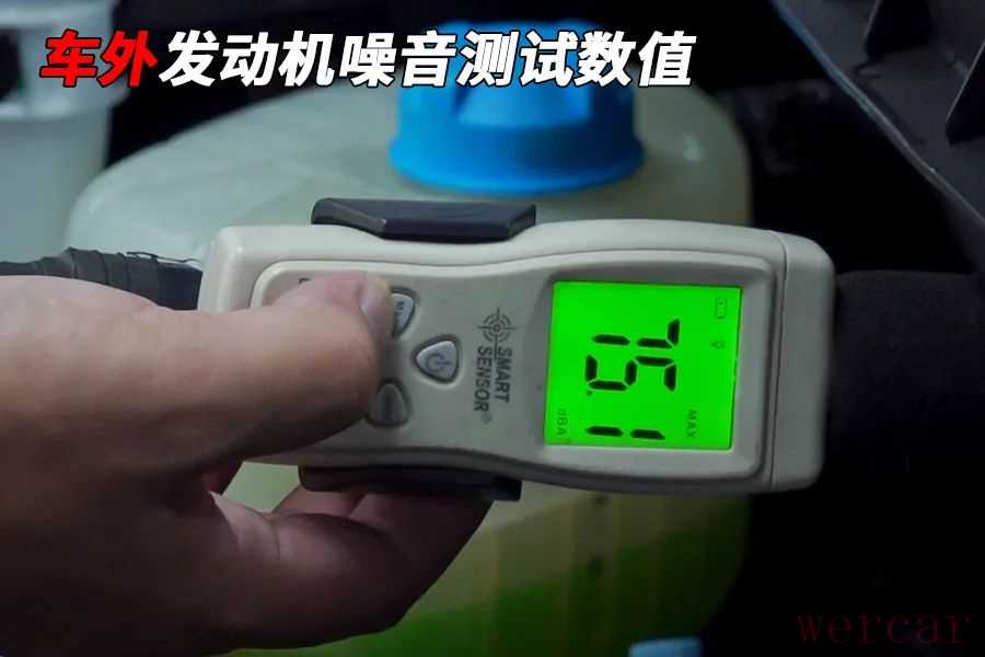 测试方法:发动机完全热机,水温正常,关闭空调,正常怠速下进行测试;打开发动机盖、取下引擎罩,在距离发动机机体上方20厘米处,进行噪音采集,取平均值,为车外发动机噪音数值(dBa);在车内,将车窗关闭,发动机空载运转2000转/分,将噪音仪置于方向盘正上方,取平均值,为车内发动机噪音(dBa)数值。并且以车内30%,车外70%的权重进行综合计算。