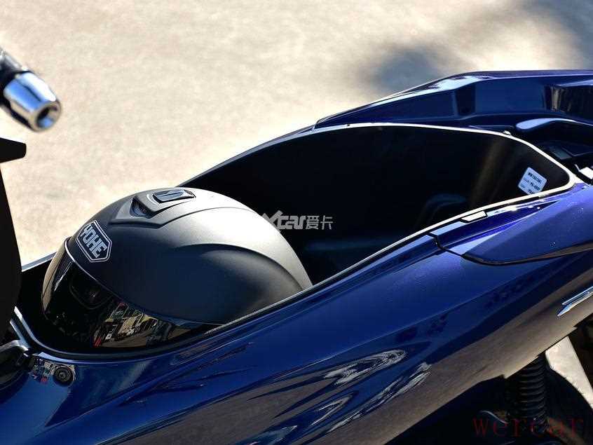 28L的座桶储物空间可谓是收纳控们的福利,如图所示的方式可以勉强放入一定全盔,放入全盔后,座桶几乎还有1/3的空间来收纳其他杂物。