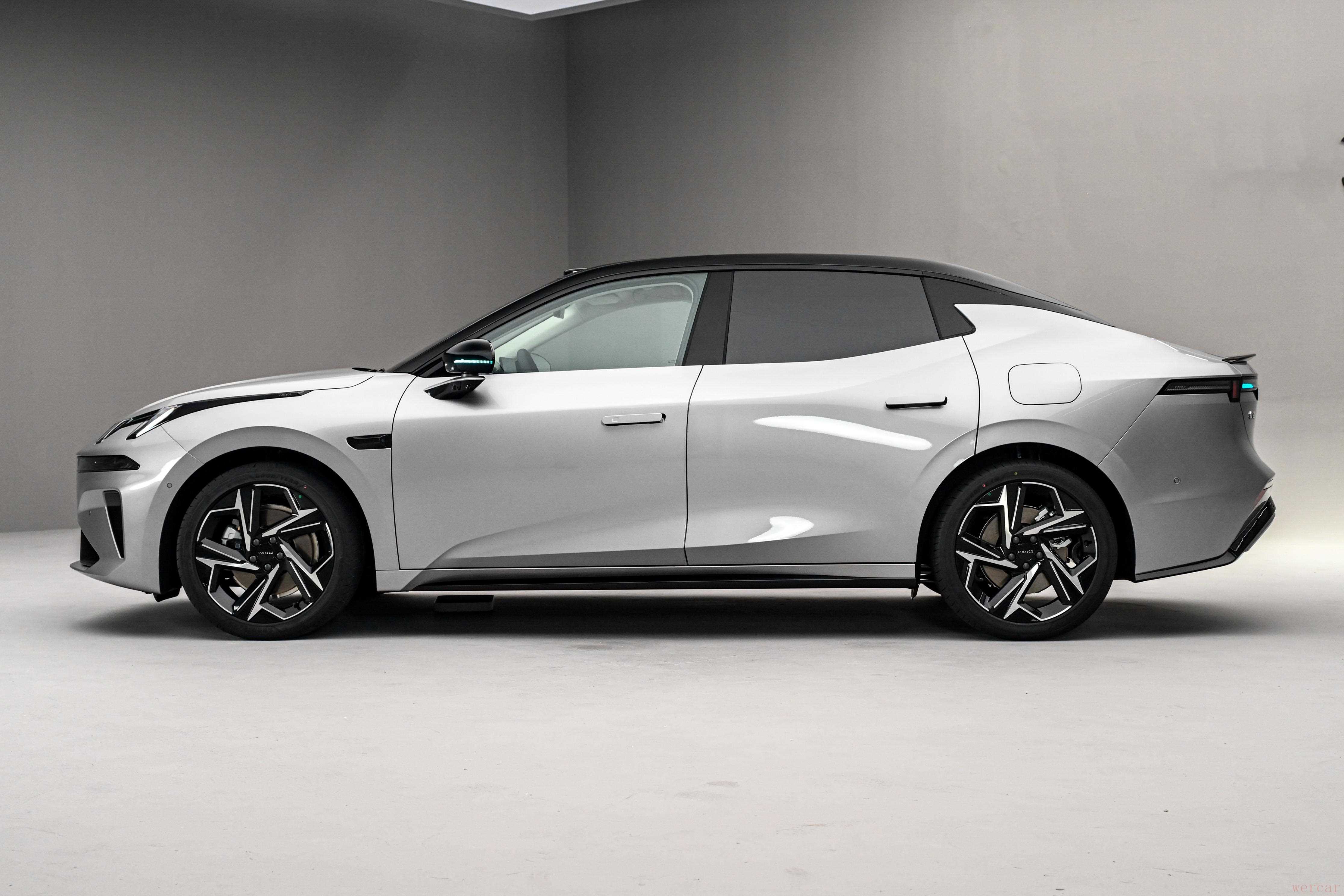 车身侧面的溜背线条很流畅,从车顶一直延伸到车尾,看起来特别运动。工作人员说这款车的风阻系数只有 0.23Cd,这个数据在同级车型里算很不错的了,风阻低不仅能让车看起来更美观,还能降低能耗,后面开的时候也确实感觉到风噪控制得不错。