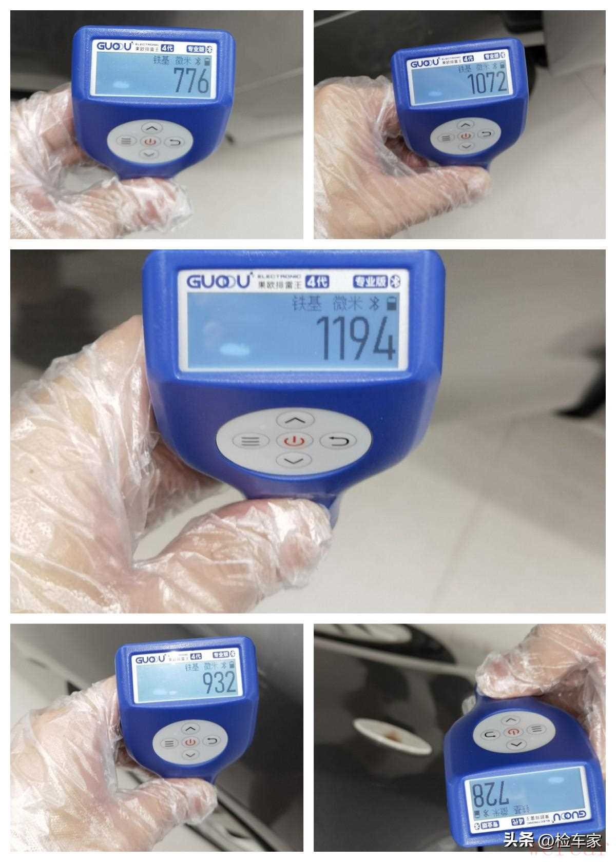 使用漆膜仪,对全车漆面进行了检测,结局果然不出所料,全车漆面几乎全军覆没,关键还都是一些钣金和腻子修复,不是简单的喷漆,这车之前的使用场景肯定是不好的。