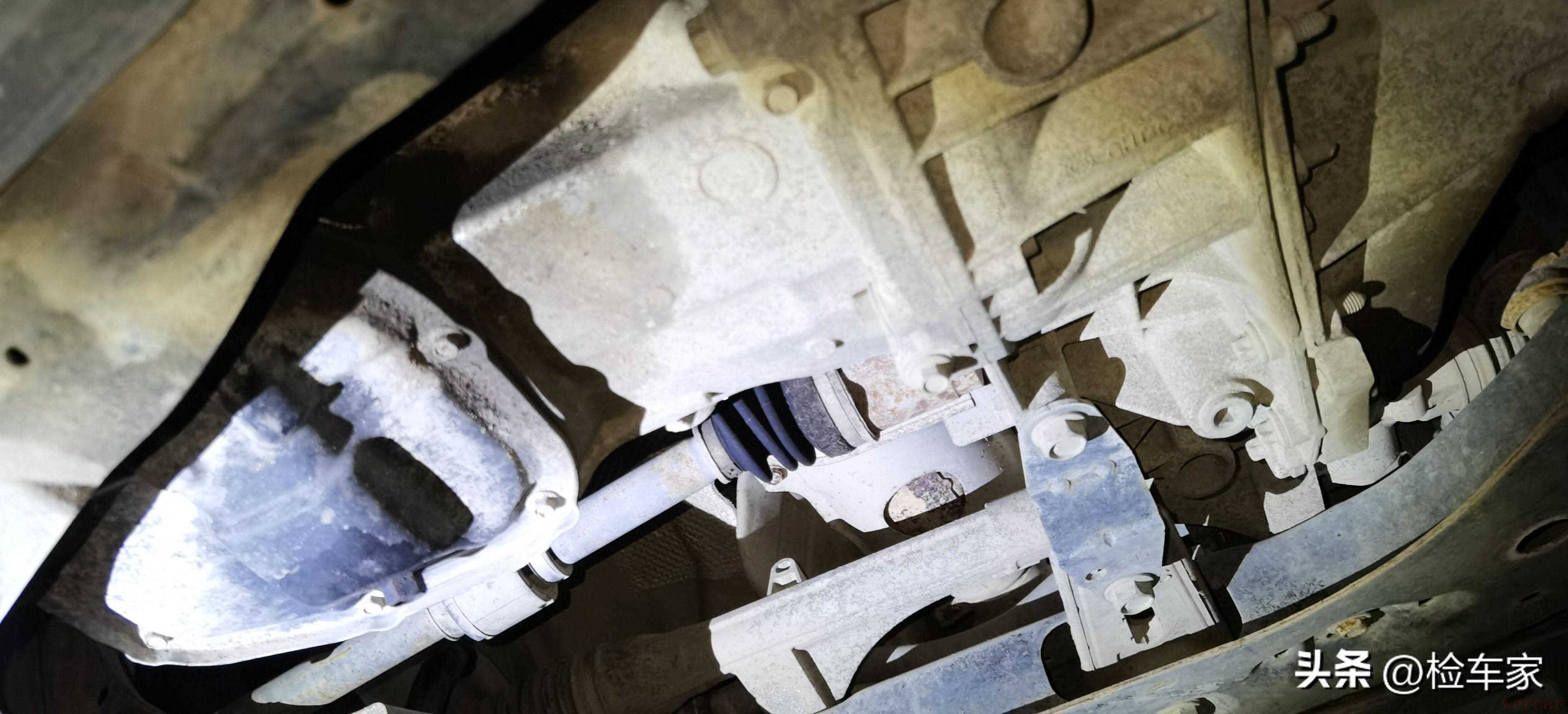 可以看到其发动机下部油泥包浆还是很严重,油泥和漏的油已经成为了一种包浆附着在发动机上,依然可以很好的佐证公里数非常大的这一推论。而且发动机如此严重的漏油,工况一定不会很好!
