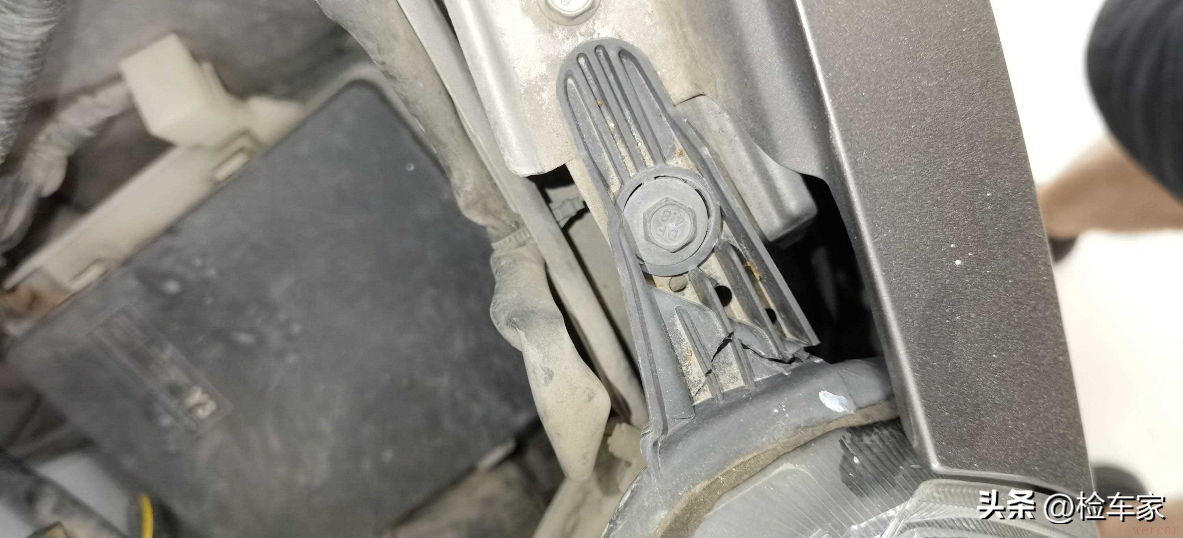 上图所示,车灯框架有非常明显的开裂,但是我们可以肯定不是事故导致的,事故怎么可能精准的只坏这一个地方,这个大家都懂的。这种现象一般出现在车龄比较大的车子上,易损件的老化加上常年共震所造成的。