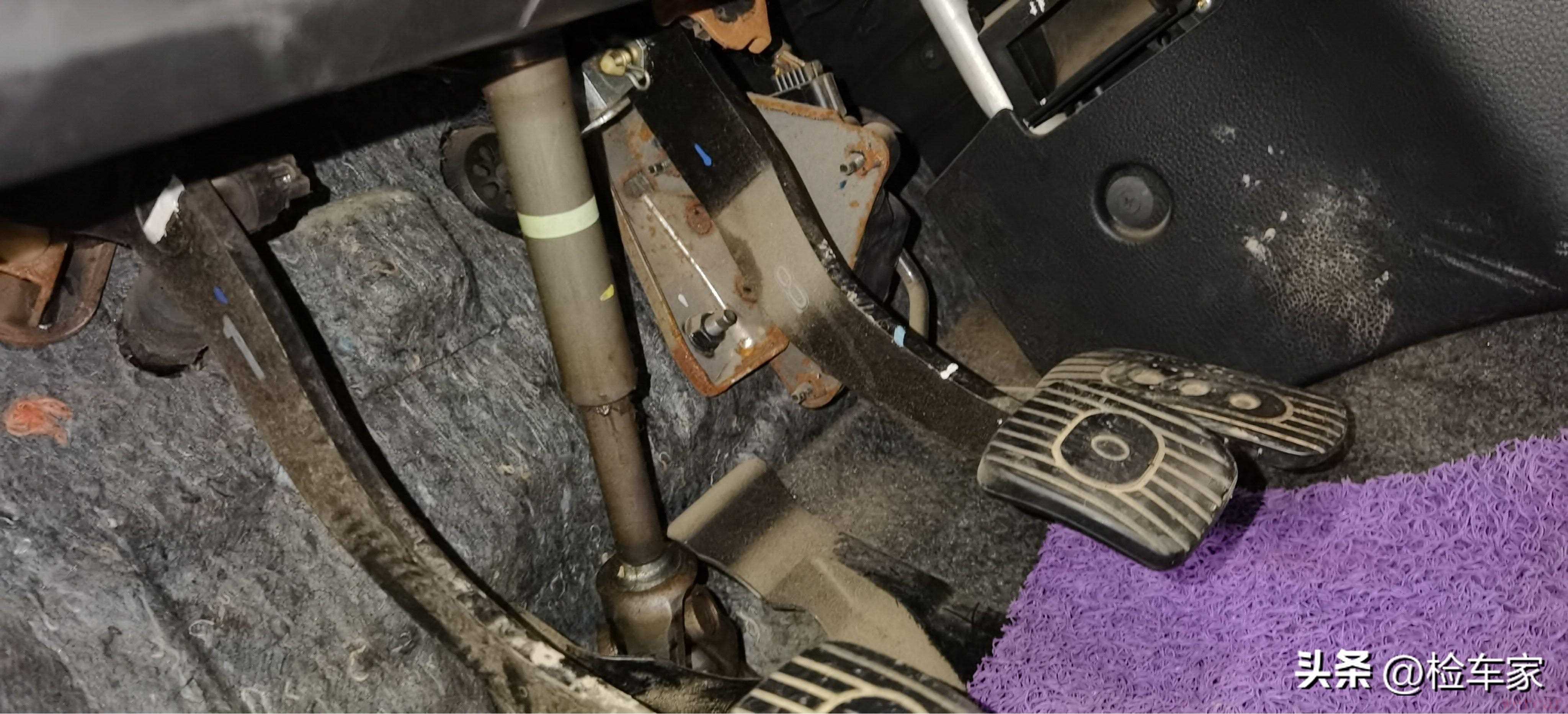 这张图看上去就比较明显了,可以看到转向轴、踏板等的磨损和生锈,依然可以很好的佐证我们前面所说的泡水和里程不符。