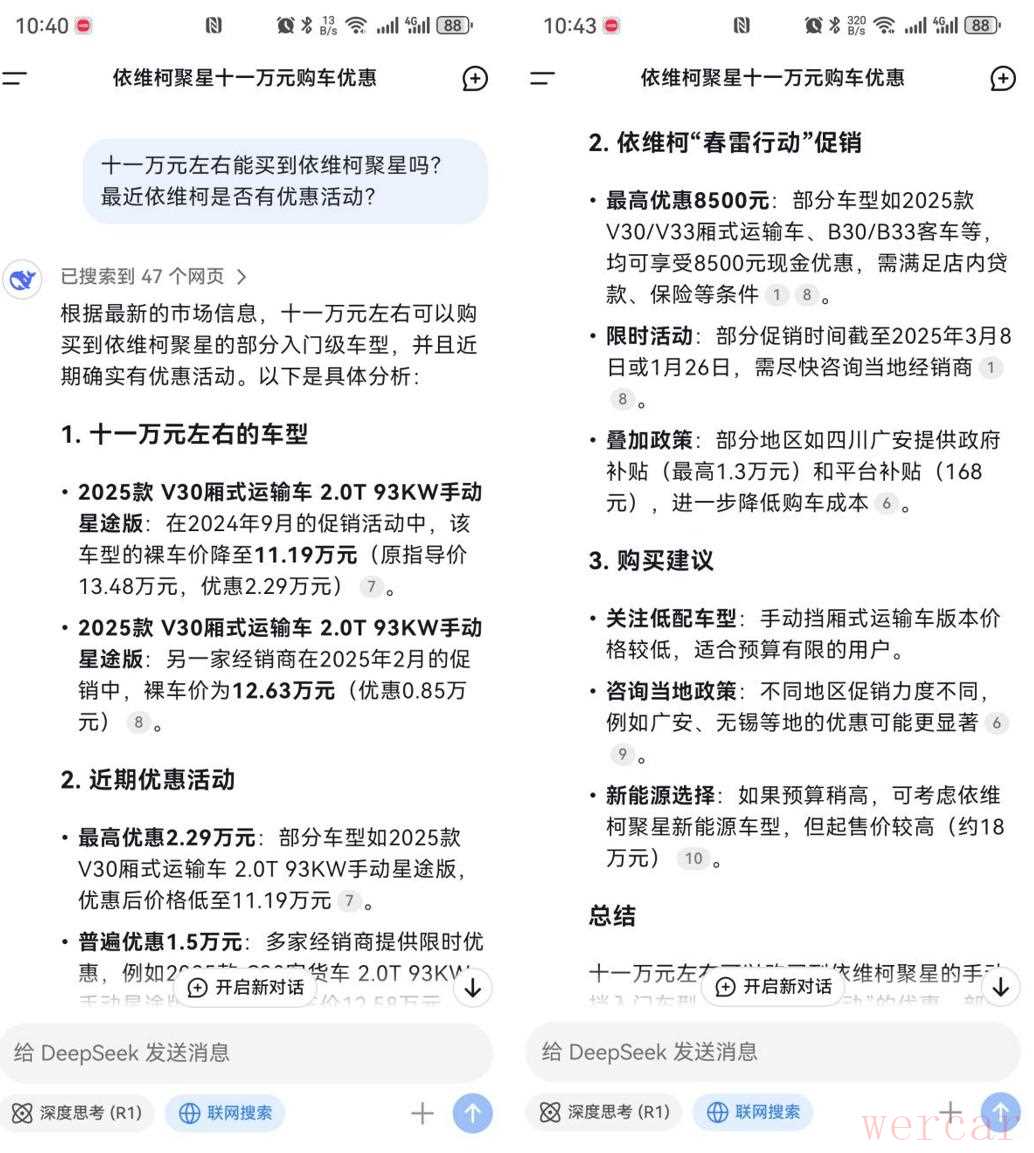 不过买车毕竟是一笔不小的开支,我又通过“DeepSeek”查询了聚星的价格区间和优惠政策,发现近期厂家有个“春雷行动”,买车有各种补贴和金融优惠,价格完全在我的预算范围内,于是转头就预约了试驾。