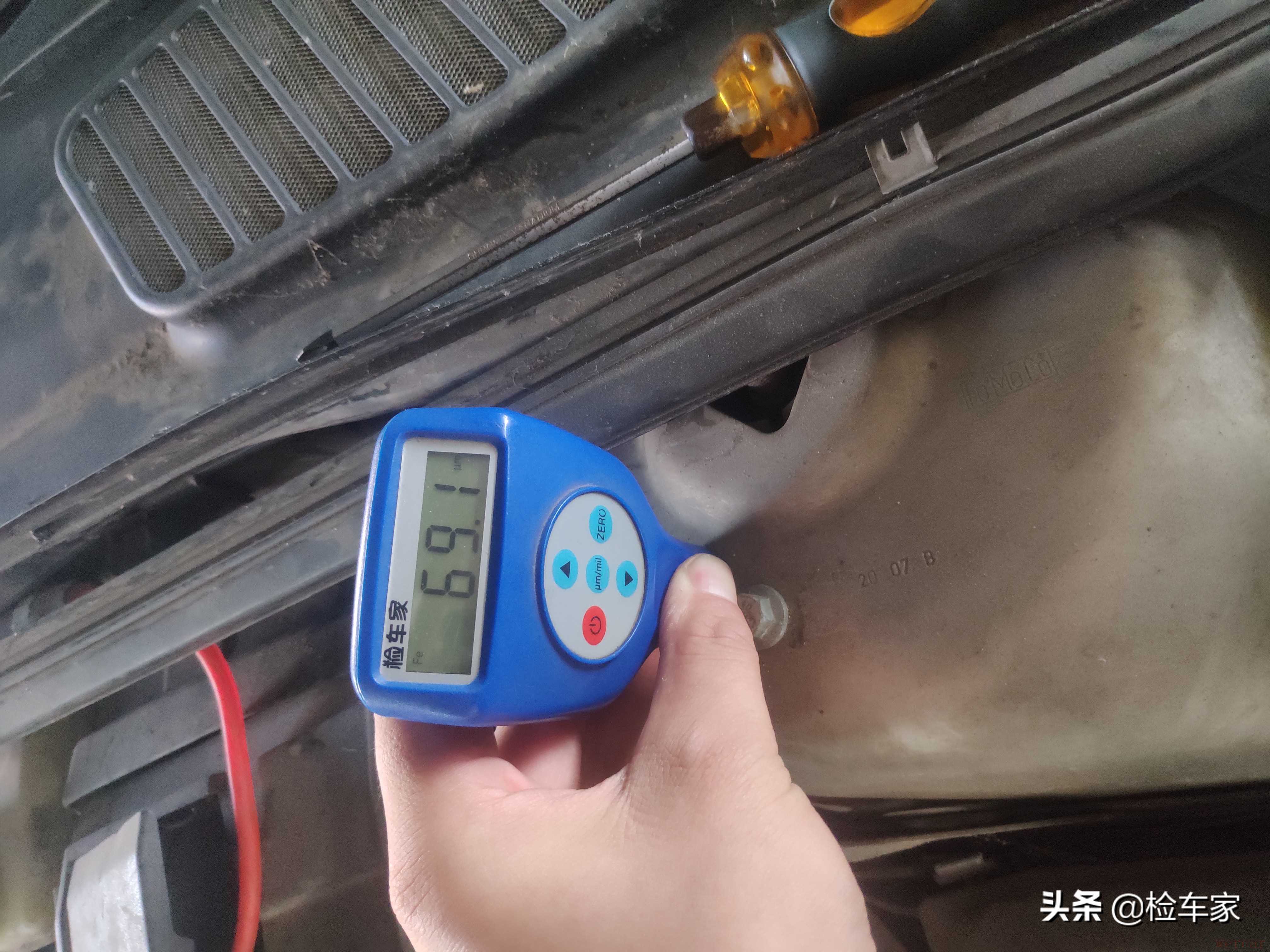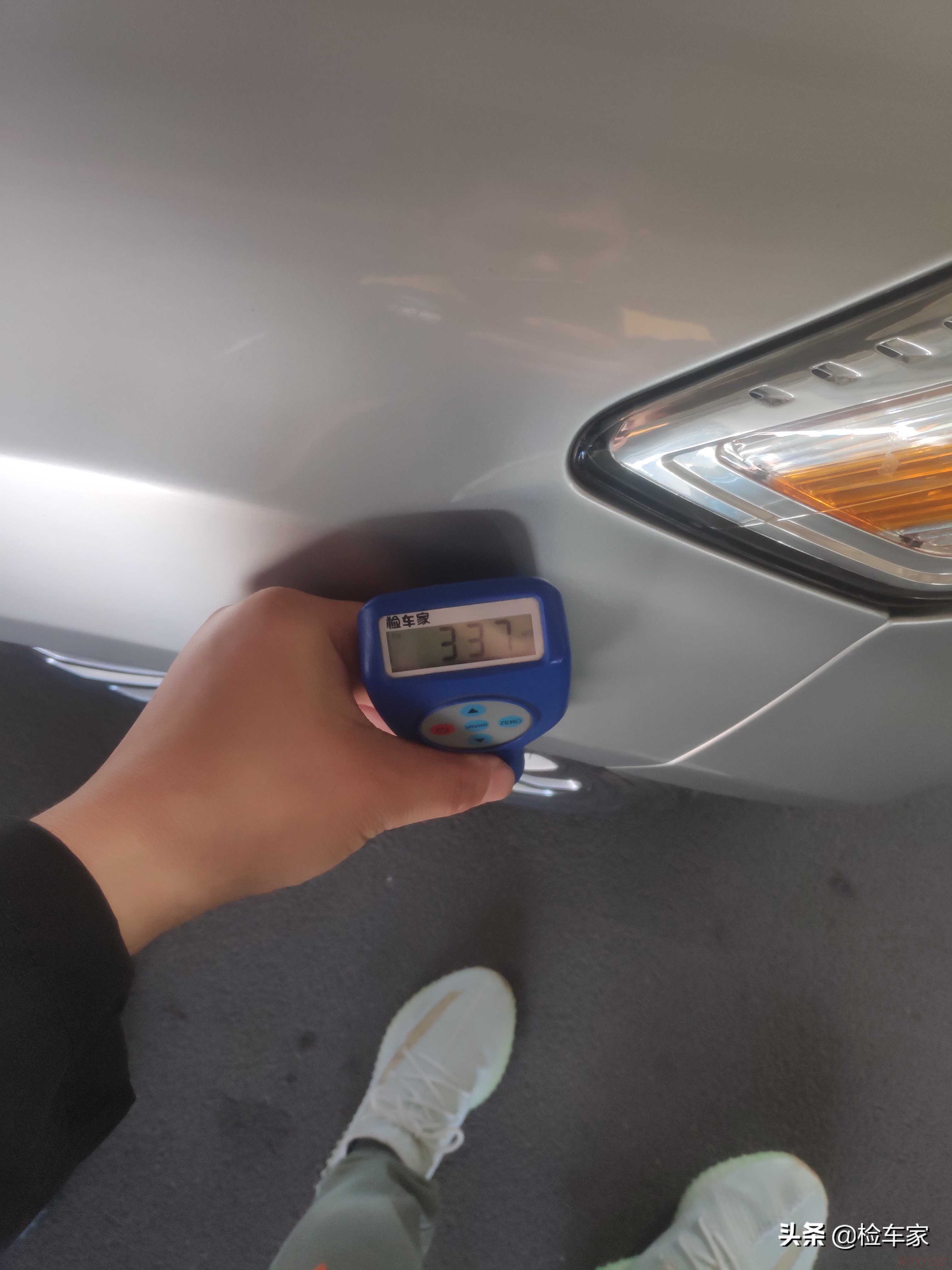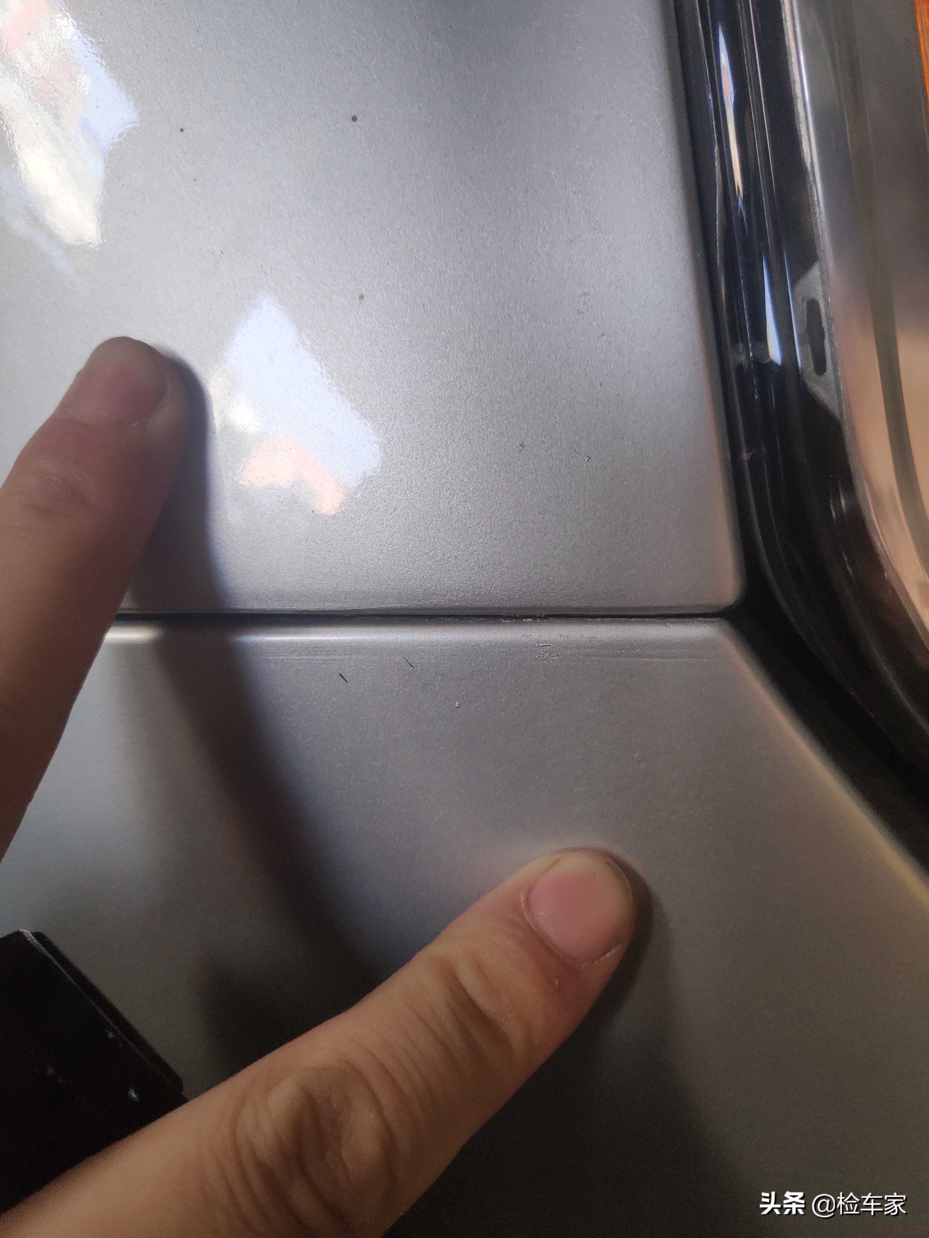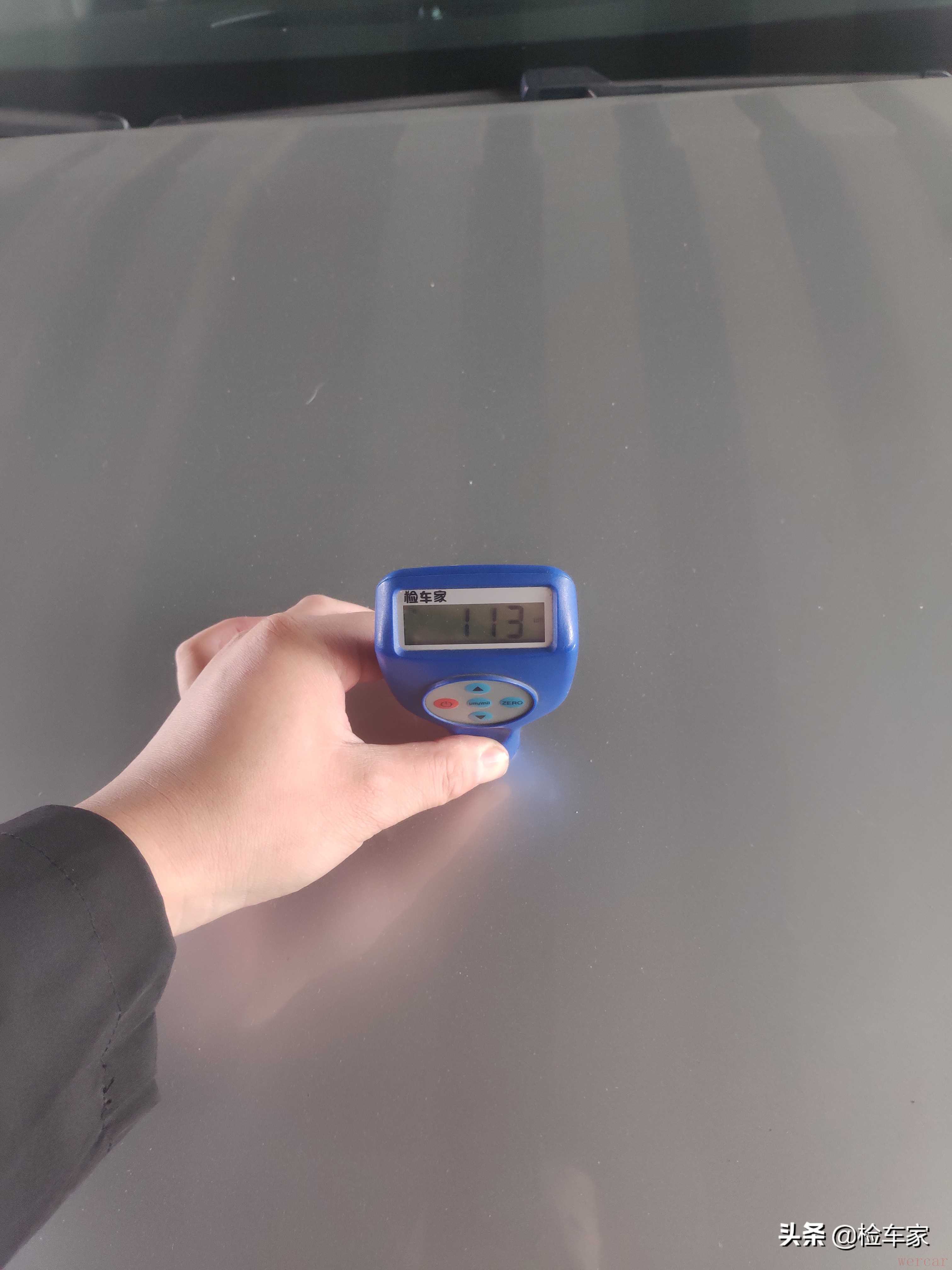 依然先从外观开始检测,首先机盖没有发现异常,漆面厚度为113μm,符合原车标准,同时手眼并用也没有发现喷漆痕迹,可以确定机盖为原厂部件。
