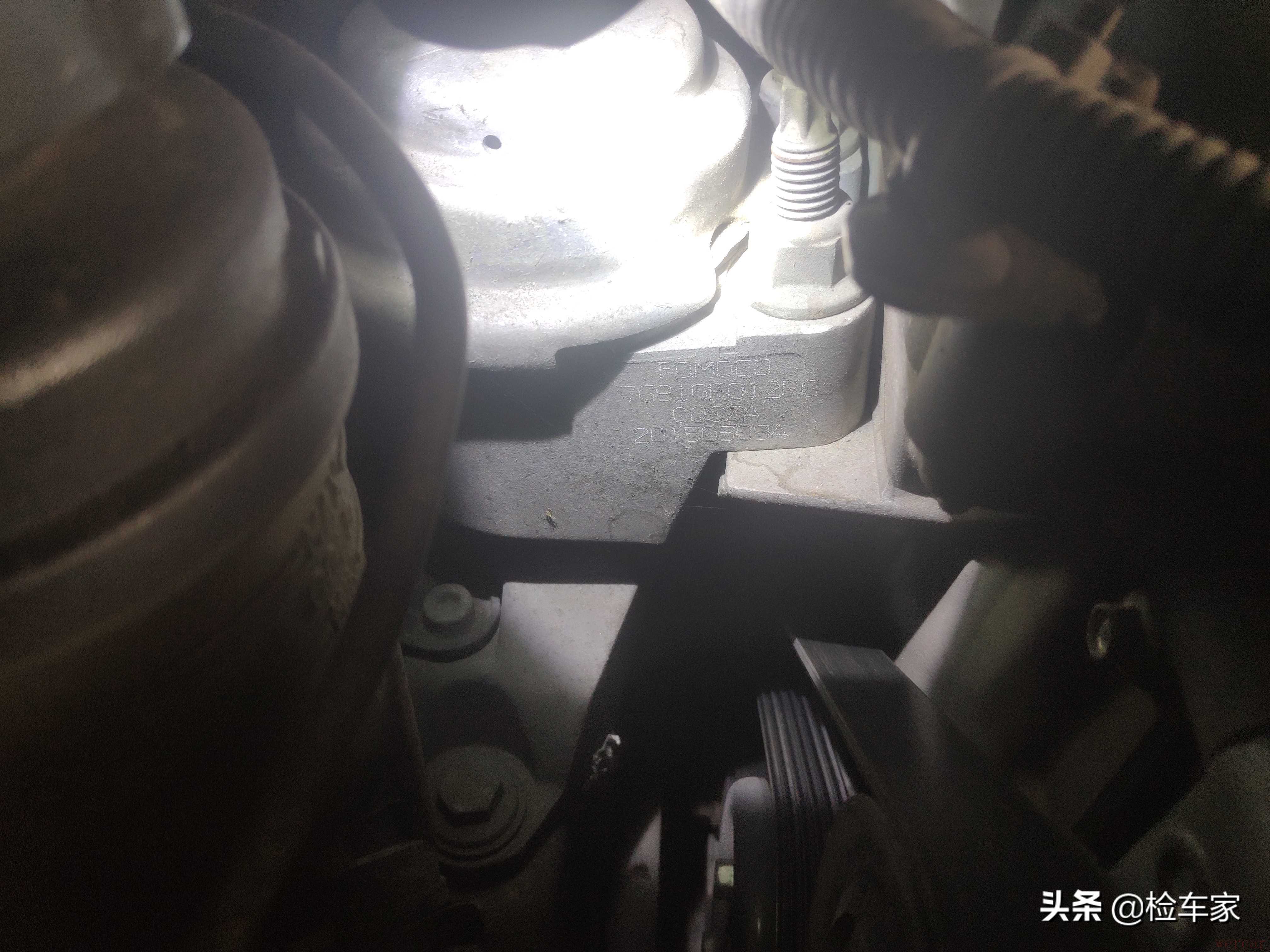 发动机右上侧机脚有明显拆卸痕迹,生产日期显示为2015年,晚于车辆总装出厂,属于后更换配件,对于老车来说,更换机脚属于正常维护,随时年份和公里数的增多,机脚胶磨损老化会导致发动机抖动异响,从而进行更换。