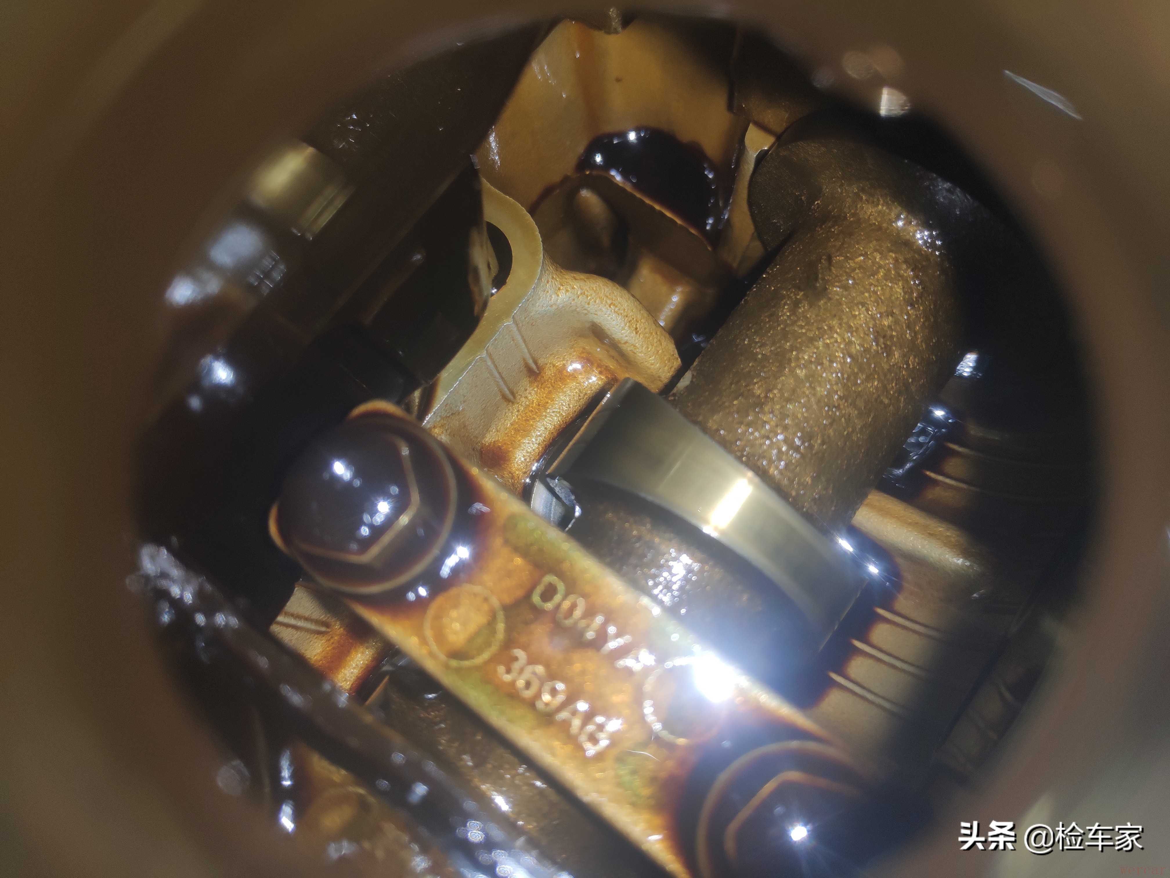 拧开机油盖,机油的状况不是很好,入手后需要立即更换;通过机油加注口可以看到凸轮轴固定螺丝没有拆卸痕迹,这是吊装维修发动机必拆的部位,这里没有动也就排除了发动机吊装分解维修的可能。