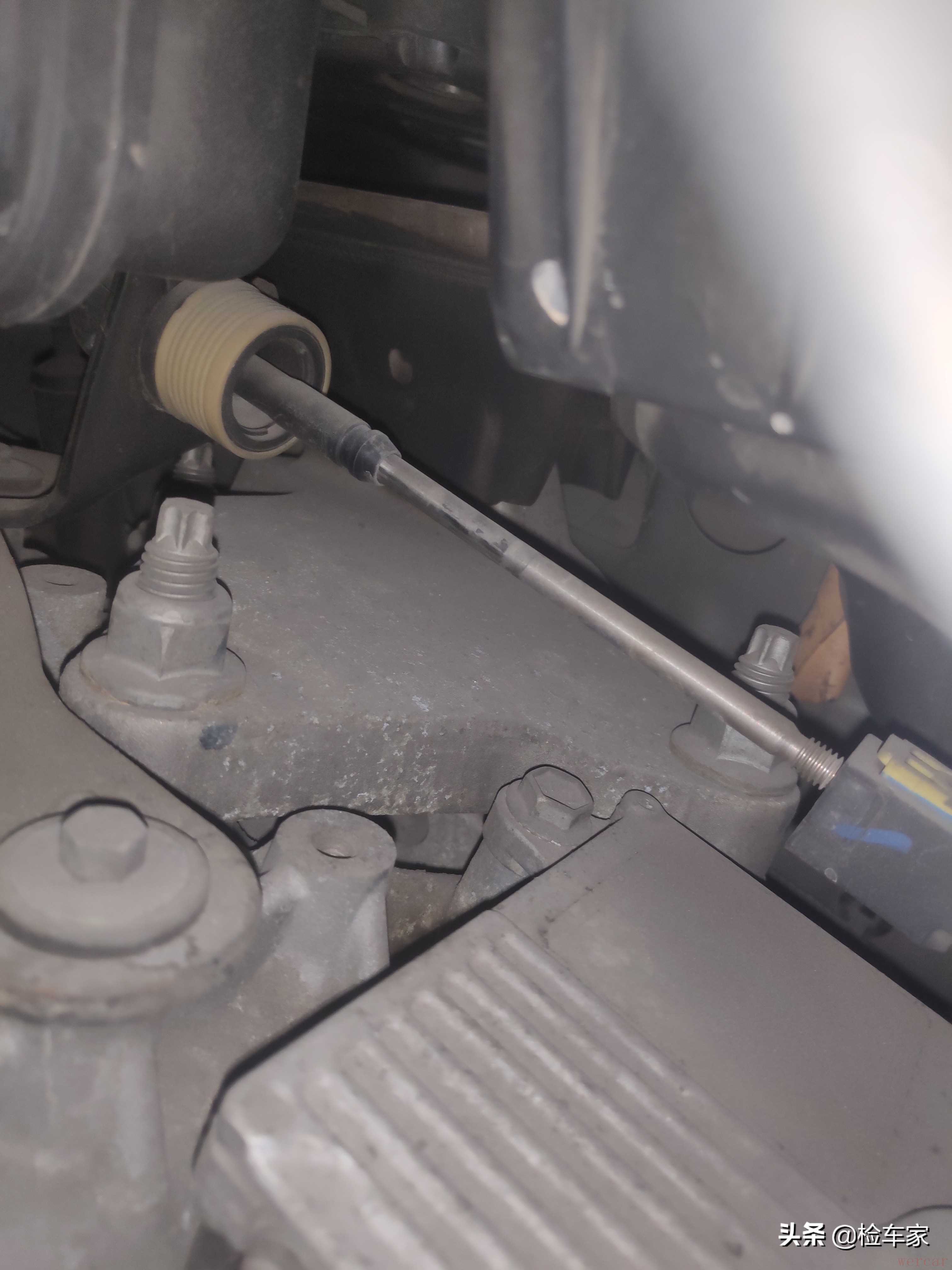 变速箱左上侧固定支架没有拆卸拧动错位痕迹,支架没有拆装,变速箱自然没有吊装维修的可能。只是工况还需要路试的时候再来验证。