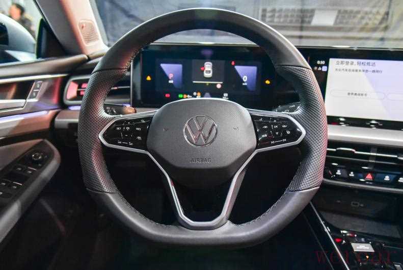 凌渡L上的这块双联屏黑框隐藏的还是挺好的,黑色主题UI也能从视觉效果上减轻边框感。两块屏幕带有一定的角度,多媒体屏幕也是倾向驾驶者一侧。近似平底的方向盘两侧有打孔皮质,握感不错,多功能按键是大众最新的触控式按键,不过它没有配换挡拨片。