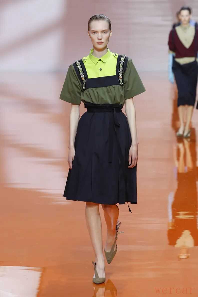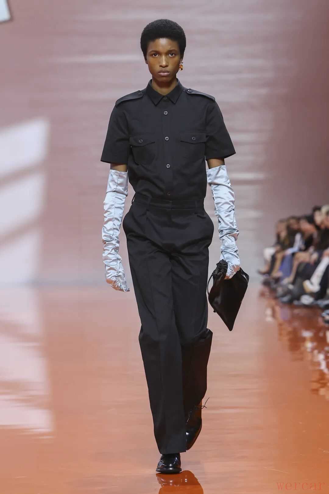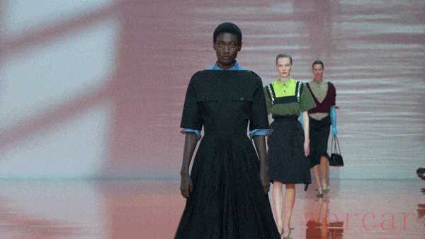 开场的两个look,是非常 Prada 式的两套制服。第一套是素雅的深蓝色,模特穿着乐福鞋、佩戴着彩色宝石的耳环,手上拿着一只长手柄的硬质皮包。第二套,颜色变成了更为鲜活的天空蓝,鞋子换成了一双黑色帆布高跟鞋,模特依然戴着彩色宝石耳环,造型上加入了丝绸手套。诚如 Raf 在秀后阐述:“制服是Prada历史的一部分 —— 对我们来说,女性可以因身着制服而美丽、优雅且强大。这挑战了既定的认知等级,也由此让女性更为自由。”