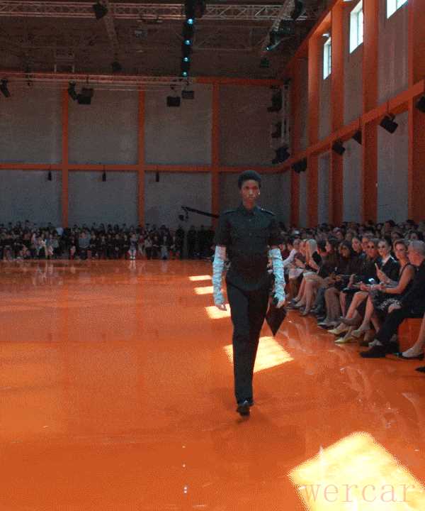 上一季度,Prada 基金会的 torre 空间,还是以脚手架搭建起来的双层空间,铺着深蓝色花纹装饰的地毯,昏暗的空间中,宾客们在脚手架之间穿梭以寻觅到自己的座位。这一季,整个空间立刻呈现出一个反转的状态:橙色亚克力地面铺满了整个空间,阳光透过钢窗洒向地面,照亮了一部分橙色,又落下一部分阴影,宾客被安排在靠近墙面的四周落座,将整个巨大的橙色舞台留给模特。