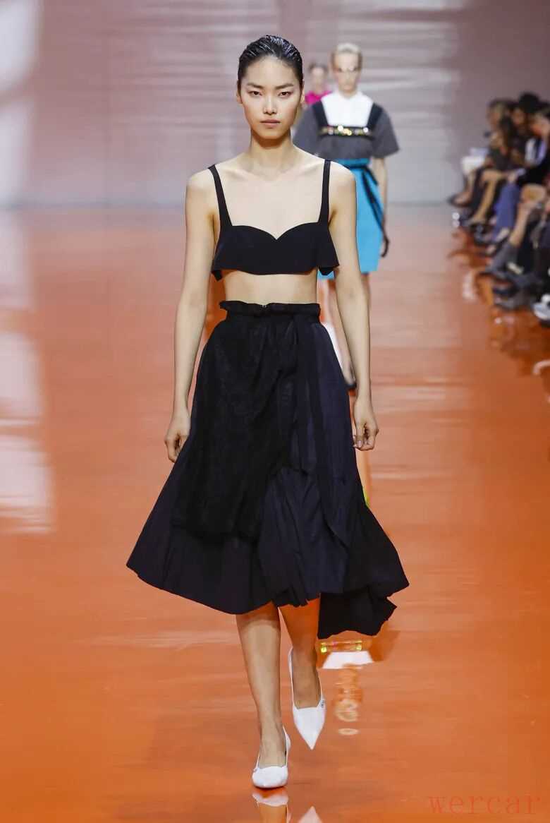 在这个系列中同样具有标志性。去掉支撑结构的胸衣,搭配以腰带束缚的半裙,服装在结构被简化后释放出前所未有的轻盈感。更耐人寻味的是,纵观整场秀,除了制服裤装依然保留拉链与纽扣之外,所有下装都改以松紧带或自由绑带完成,从而彻底摆脱了尺码与身材间的精密契合。下装的故事尚未结束,注意那些蓬蓬的半身裙,它们选用了特殊的材质,使得穿着者可以通过自己塑形半裙的形态。还有那些超短的松紧带短裤,纽扣敞开的搭配着无支撑内衣的针织衫……一切看起来都松松的。