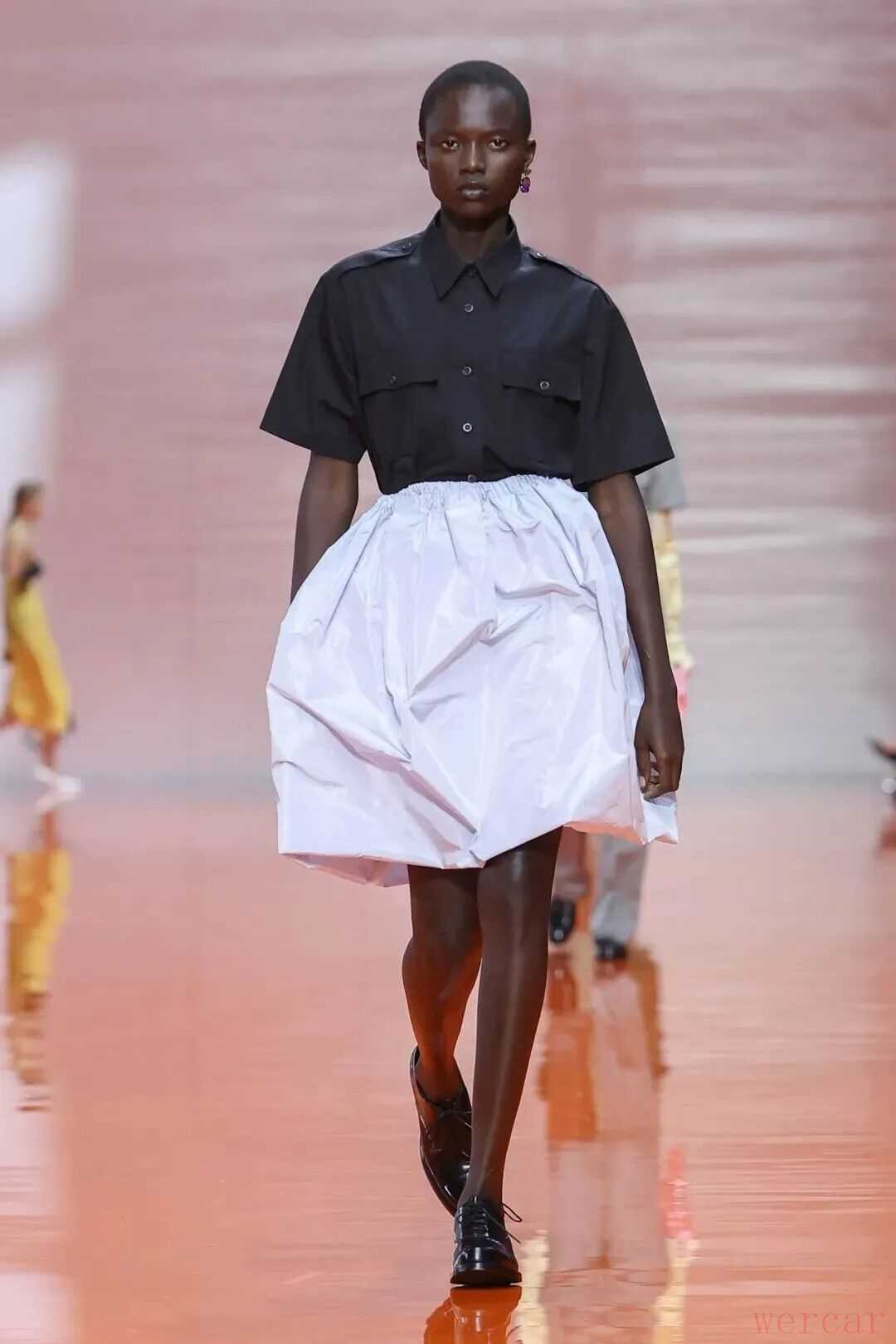 延续以往思辨性的语汇,这场秀不止是一场视觉盛宴,更像是一场关于时尚、身份与自我表达的哲学探讨。橙黄色反光地板映射着极简空间中的结构化造型,制服与晚礼服在同一语境中被并置,交织出当代女性多维度的面貌。