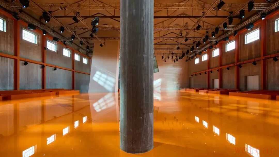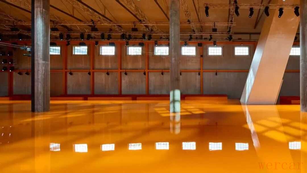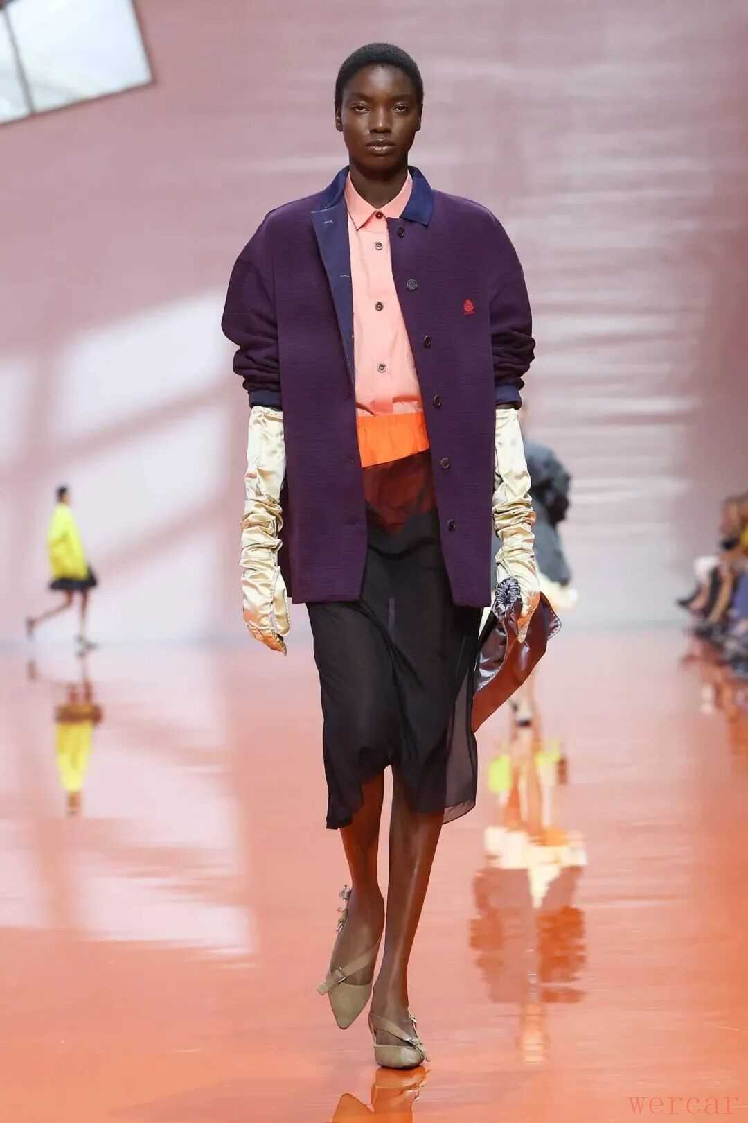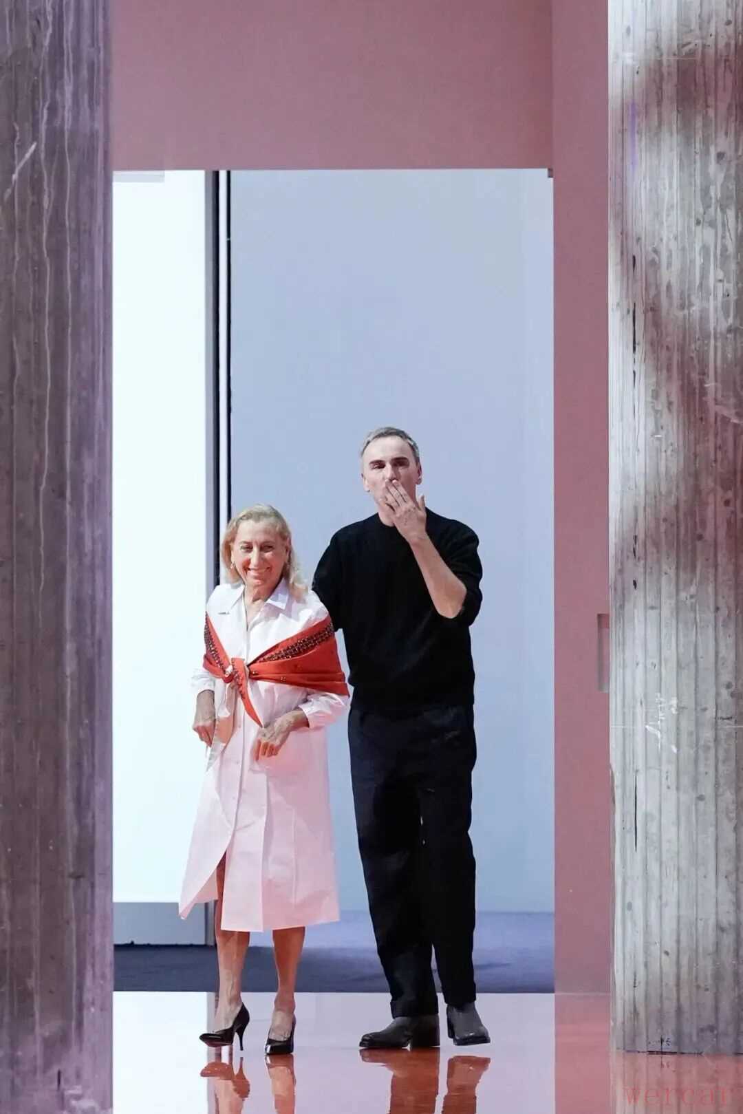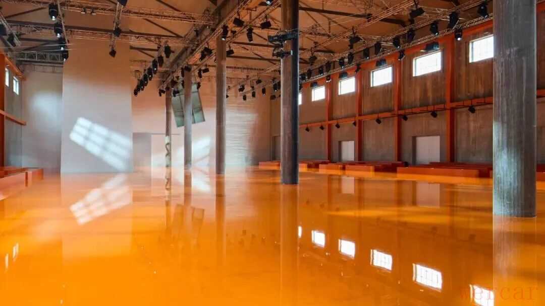 随着灯光亮起,在AMO的打造下空间被简化至只剩混凝土立柱与一块亮橙色地板,简约的空间成为两位创意总监的对话舞台。在Miuccia Prada和Raf Simons的眼中,女性气质被重新定义,不再是单向的柔美。