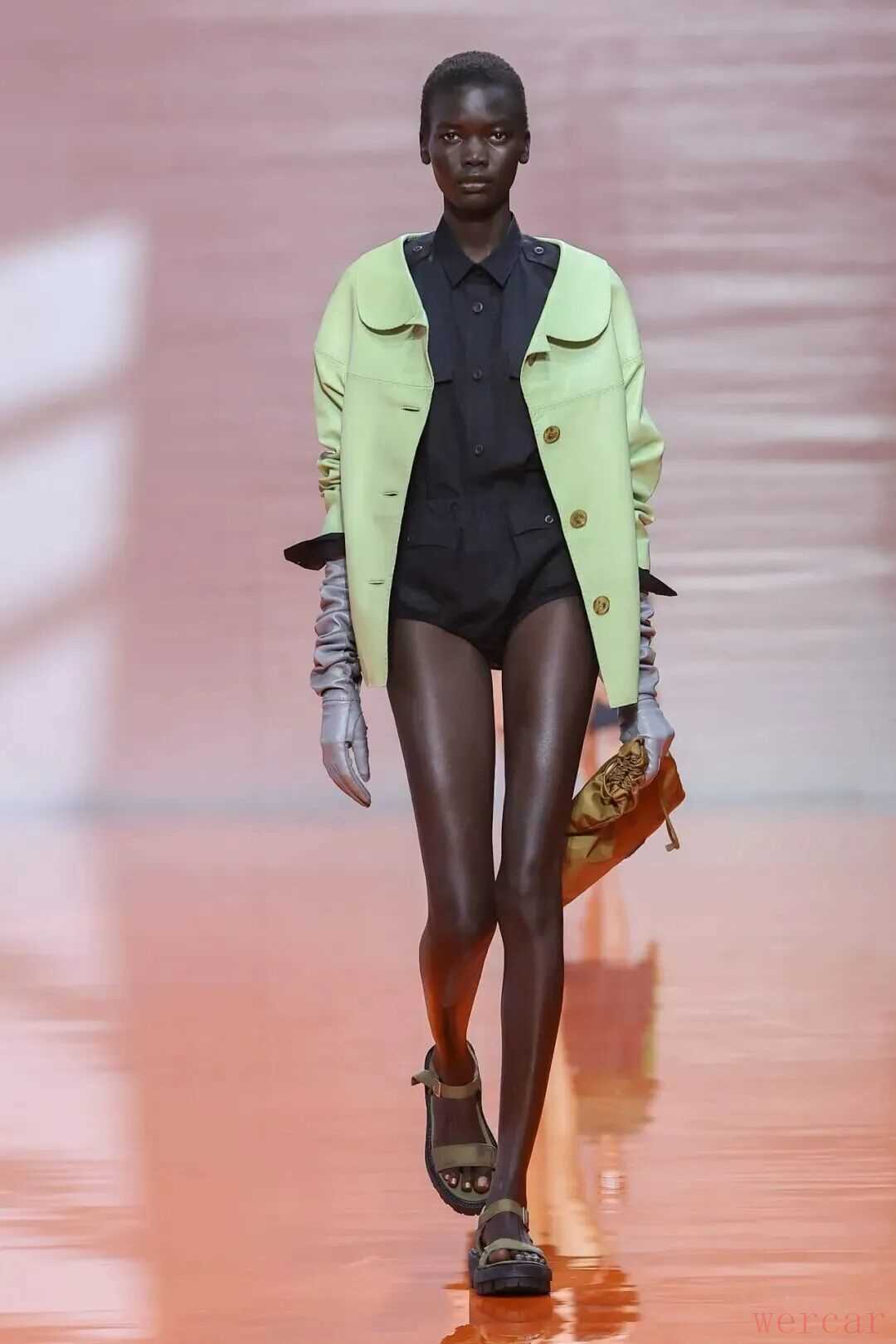 此次秀场和以往一样,空间设计延续了品牌一贯的先锋性,呼应结束不久的2025秋冬男装秀。短裤、糖果色调、运动夹克再次点亮秀场,只不过利落的廓形在娃娃领等装饰的点缀下更为轻盈。女性不仅仅是柔和的、优雅的,她们也可以是锋利的、强势的。
