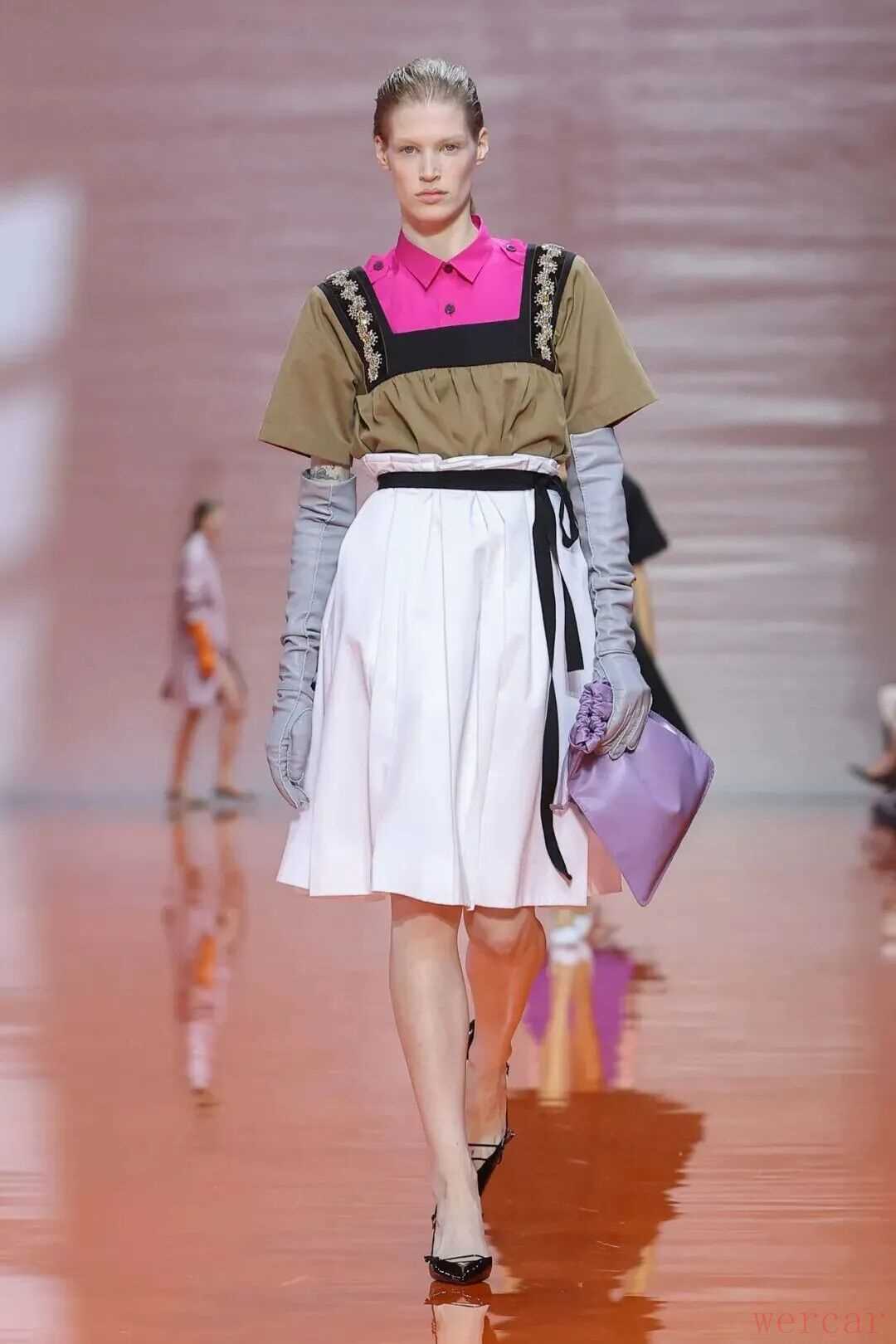 “我们总想提供一些新的东西——只不过总无法避免回顾过往。你会开始思考服装的意义——事物在过去的意涵,我们又如何在今日重新评估。制服是Prada历史的一部分——对我们来说,女性可以因身着制服而美丽、优雅且强大。这挑战了既定的认知等级,也由此让女性更为自由。”