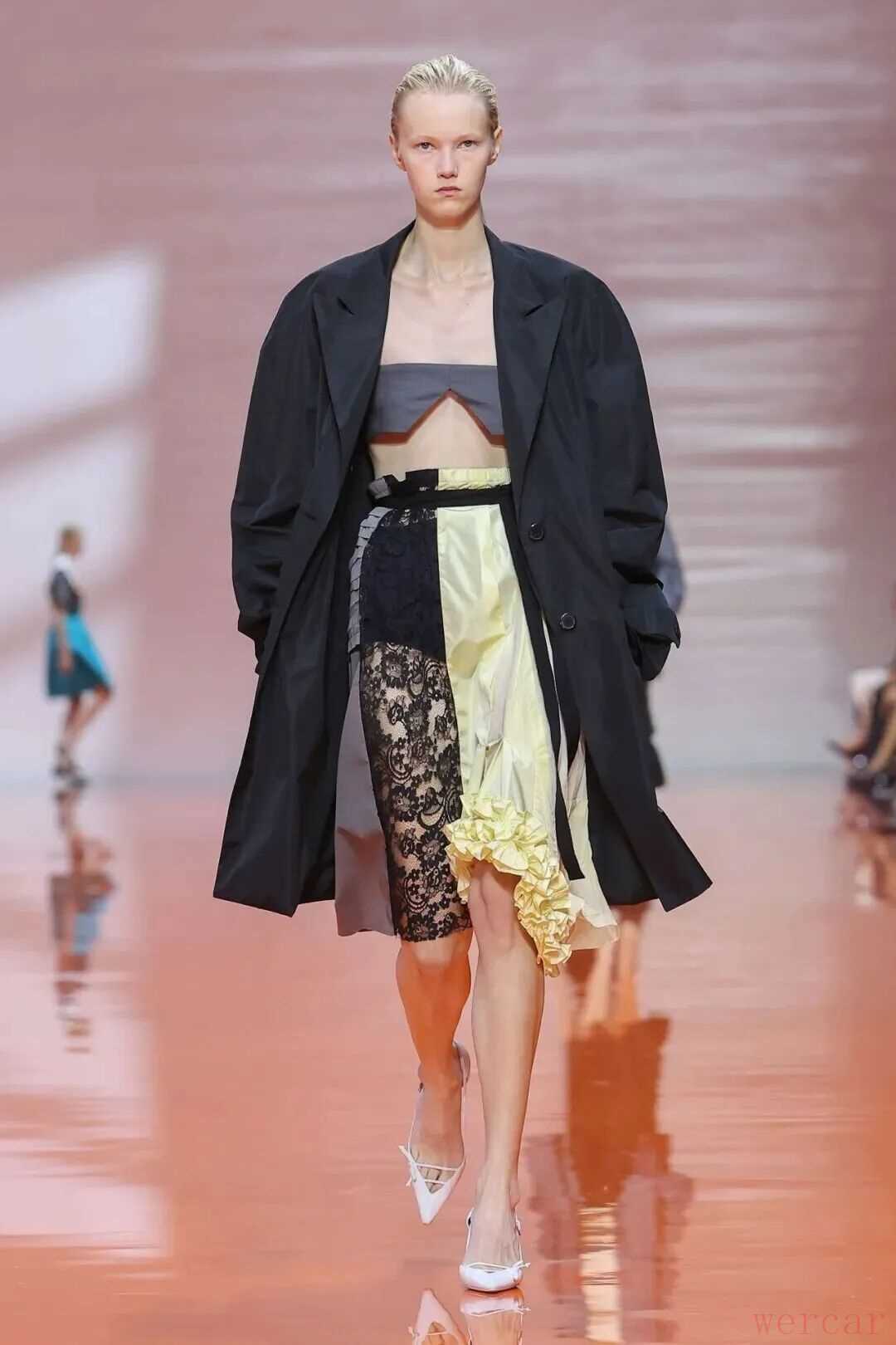 对于 Prada 裙装收藏者而言,这一季堪称经典。拼接面料、肩部延展的裙型、荷叶边的局部装饰构成层次之美,吊带裙与裙裤组合的新廓形则打破对身体的既定想象,让“构筑”成为一种视觉语言。