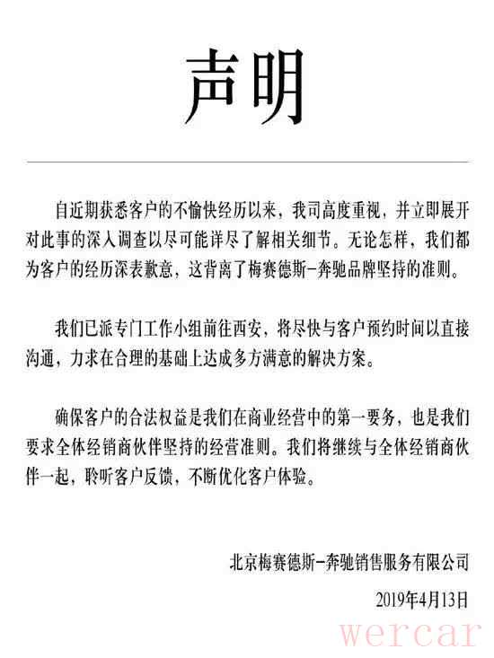 在媒体介入调查此事后,当地市场监管部门已成立多部门组成的联合调查组,正调查车辆在销售前是否存在质量问题。而直到在全国引起轩然大波后,北京梅赛德斯-奔驰销售服务有限公司才于4月13日下午在微博发表了一则声明,表示已派专门工作小组前往西安,立即展开对此事的深入调查,力求在合理的基础上达成多方满意的解决方案。