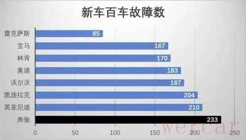 根据国内最大的汽车垂直媒体提供的新车质量报告,在整个2017年里,奔驰品牌车型总体的新车百车故障数达到233个,奔驰的产品质量已在各大豪华品牌阵营中垫底。在今年3月中国消费者协会发布的《2018年全国消协组织受理汽车产品投诉情况分析》报告中,奔驰位列投诉量第二,其中很大问题集中在质量问题和售后服务上。