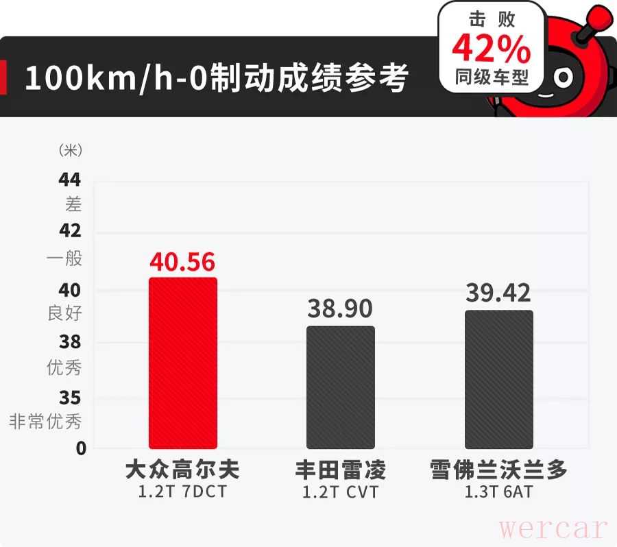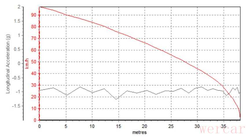 在车速达到105km/h左右时全力制动,初始加速度就达到-1g左右,表现不俗。中后程加速度也能维持在-0.8g到-1g之间,制动力没有明显衰减。最终,测得高尔夫的百公里制动距离为40.56米,属于同级中等偏下的水平。需要指出的是,刹车踏板虚位较小且脚感偏硬,初次上手可能需要时间适应。
