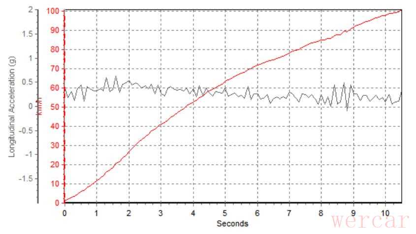 随着车速加快,动力表现有所放缓,加速度逐渐回落至0.3g左右。好在双离合变速箱能发挥出换挡迅速的优势,两次换挡并没有占据太多时间。最终。高尔夫取得10.42秒破百的加速成绩,就其排量而言属于较好的水平。